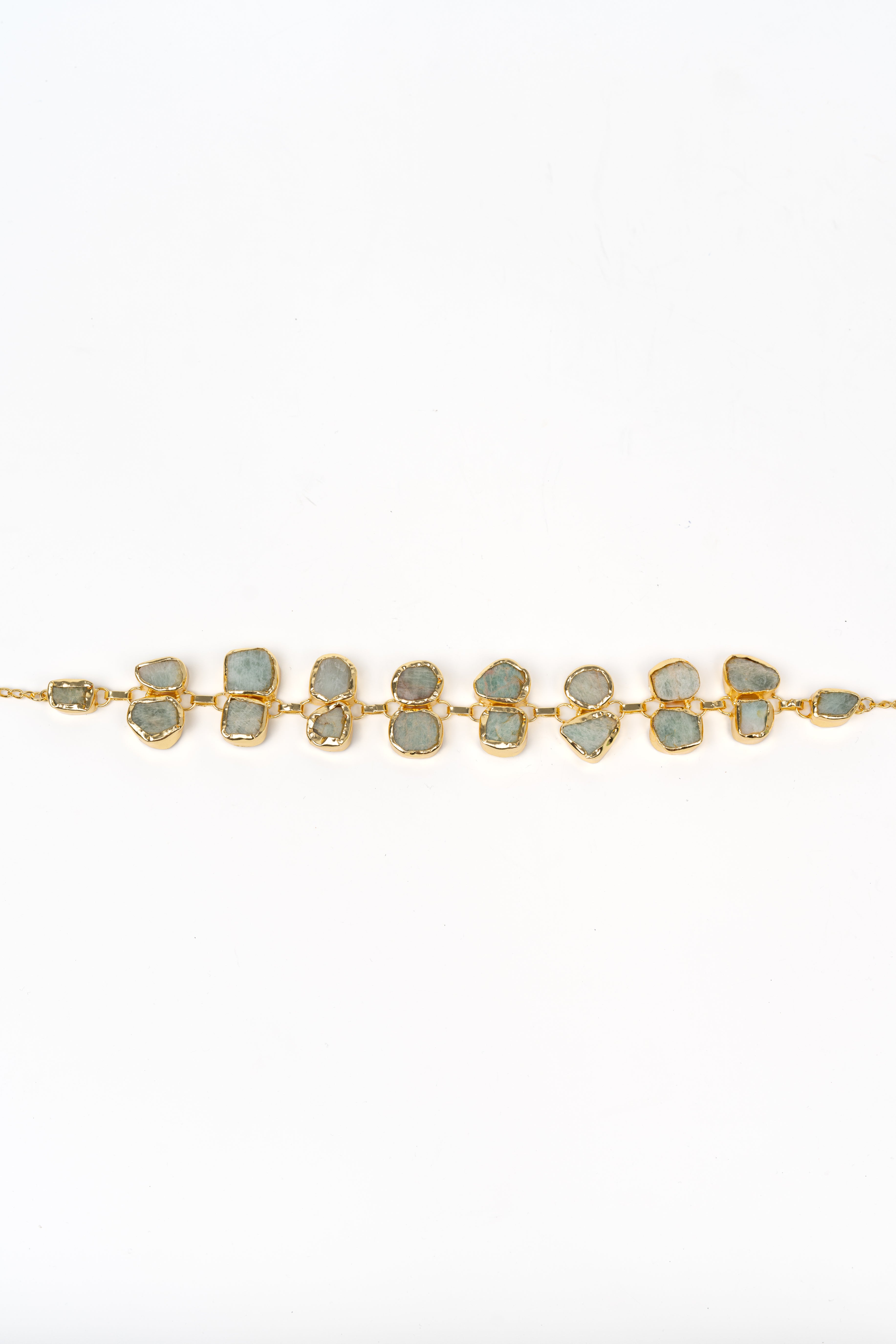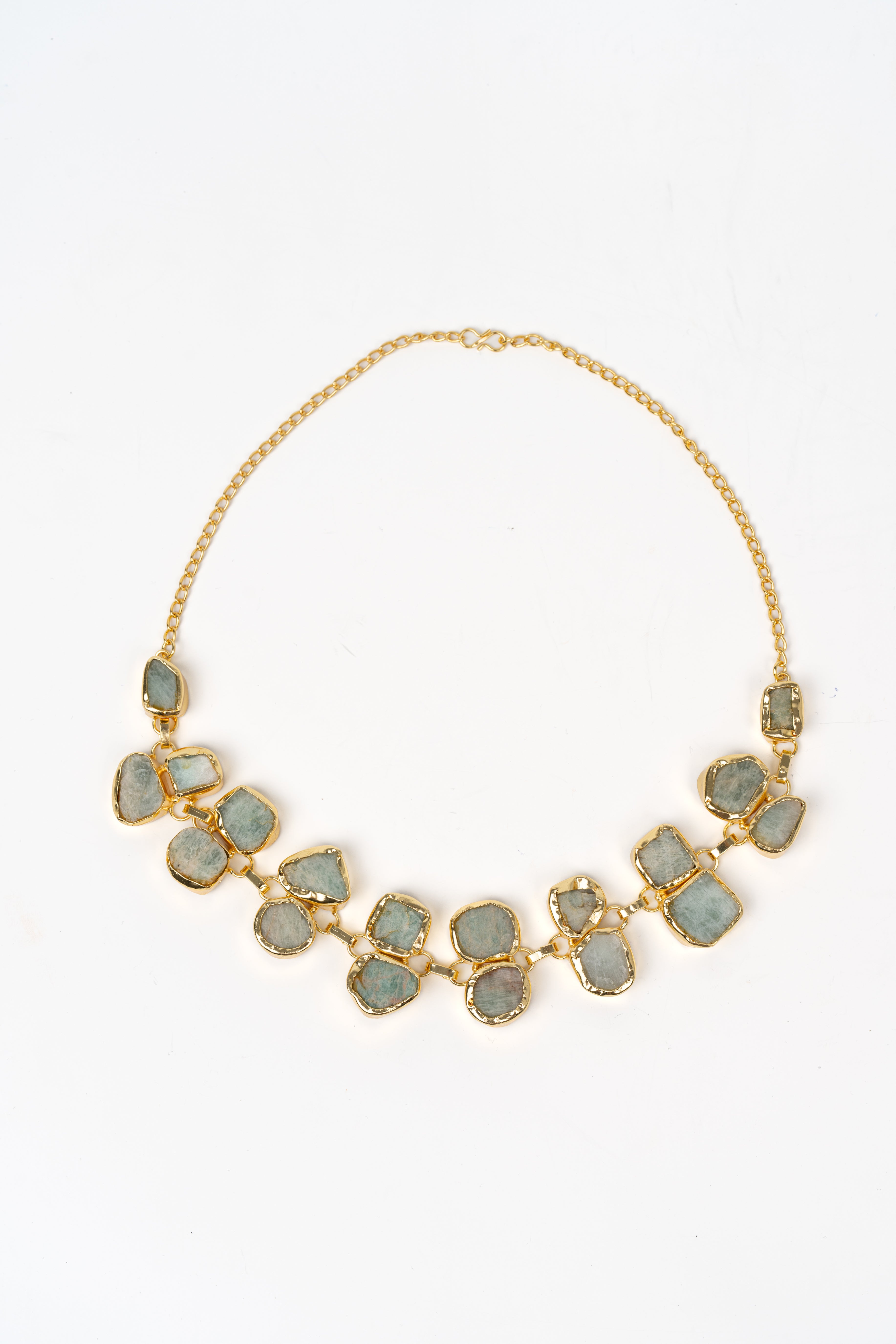 Collar dorado con piezas irregulares de piedras verdes ensambladas de forma articulada.