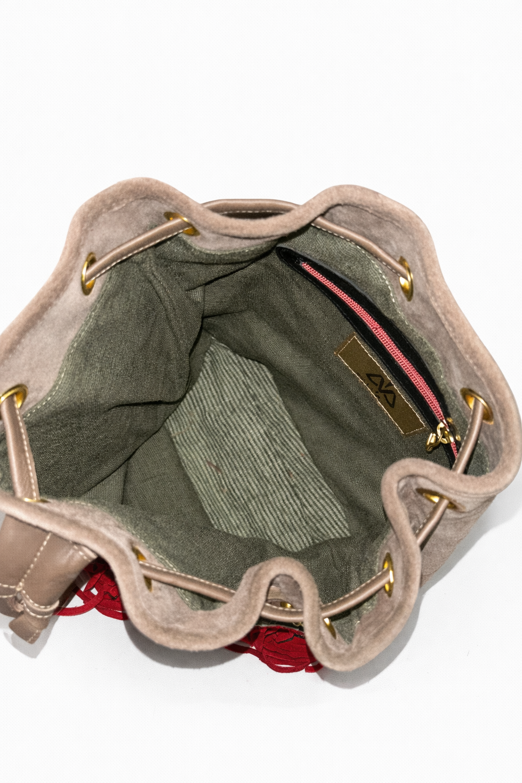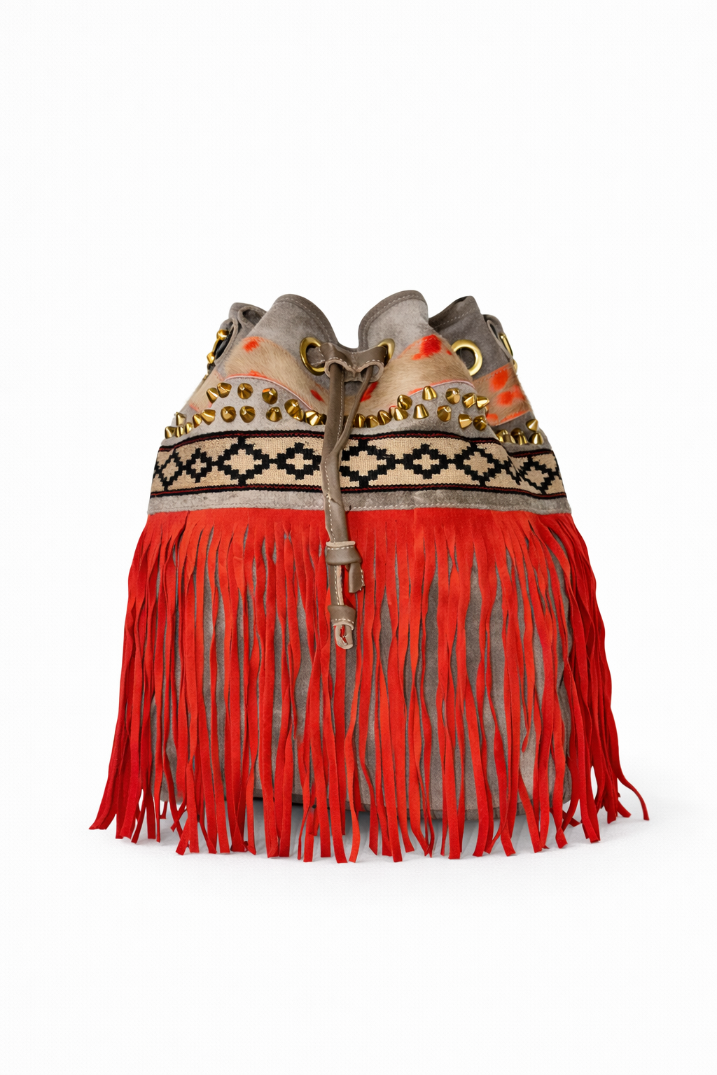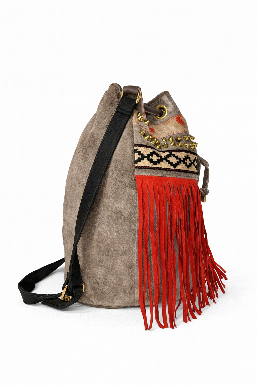Bucket inspiración artesanal con tejido étnico y flecos rojos. Pieza especial. Serraje/piel + tejido étnico. Flecos de piel. Fornituras bañadas en oro. Forro interior en tejido estampado exclusivo, con bolsillo interior con cremallera.