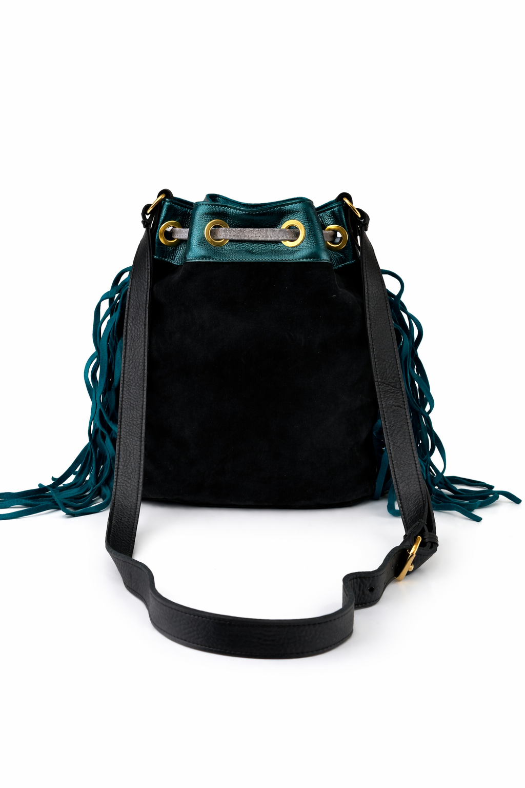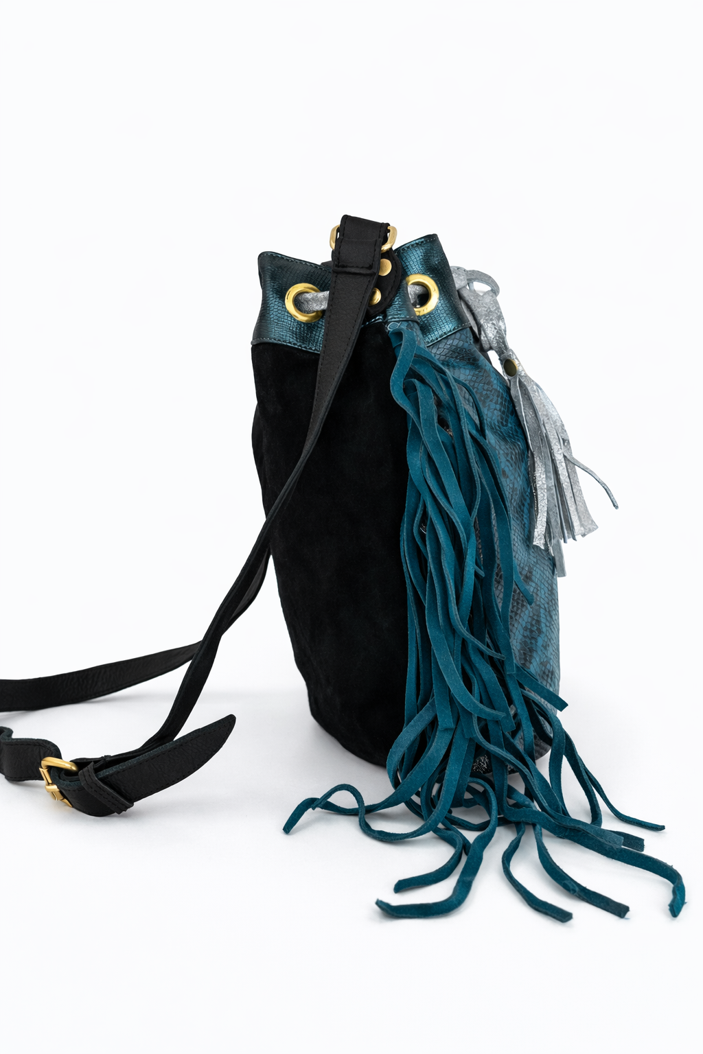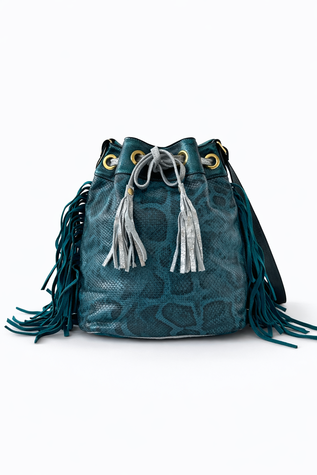 Bucket serpiente azul con borlas en tono plata. Piel grabada efecto serpiente + serraje. Borlas de piel. Fornituras bañadas en oro. Forro interior en tejido estampado exclusivo, con bolsillo interior con cremallera.