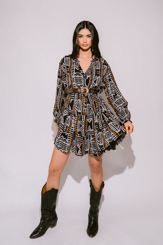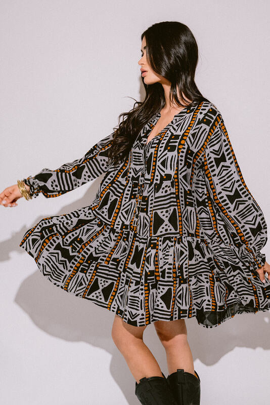 Vestido corto estampado en gris, negro y mostaza. Con escote en pico, manga larga y puños elásticos. Silueta amplia y cómoda, ideal para un look casual con aire boho.