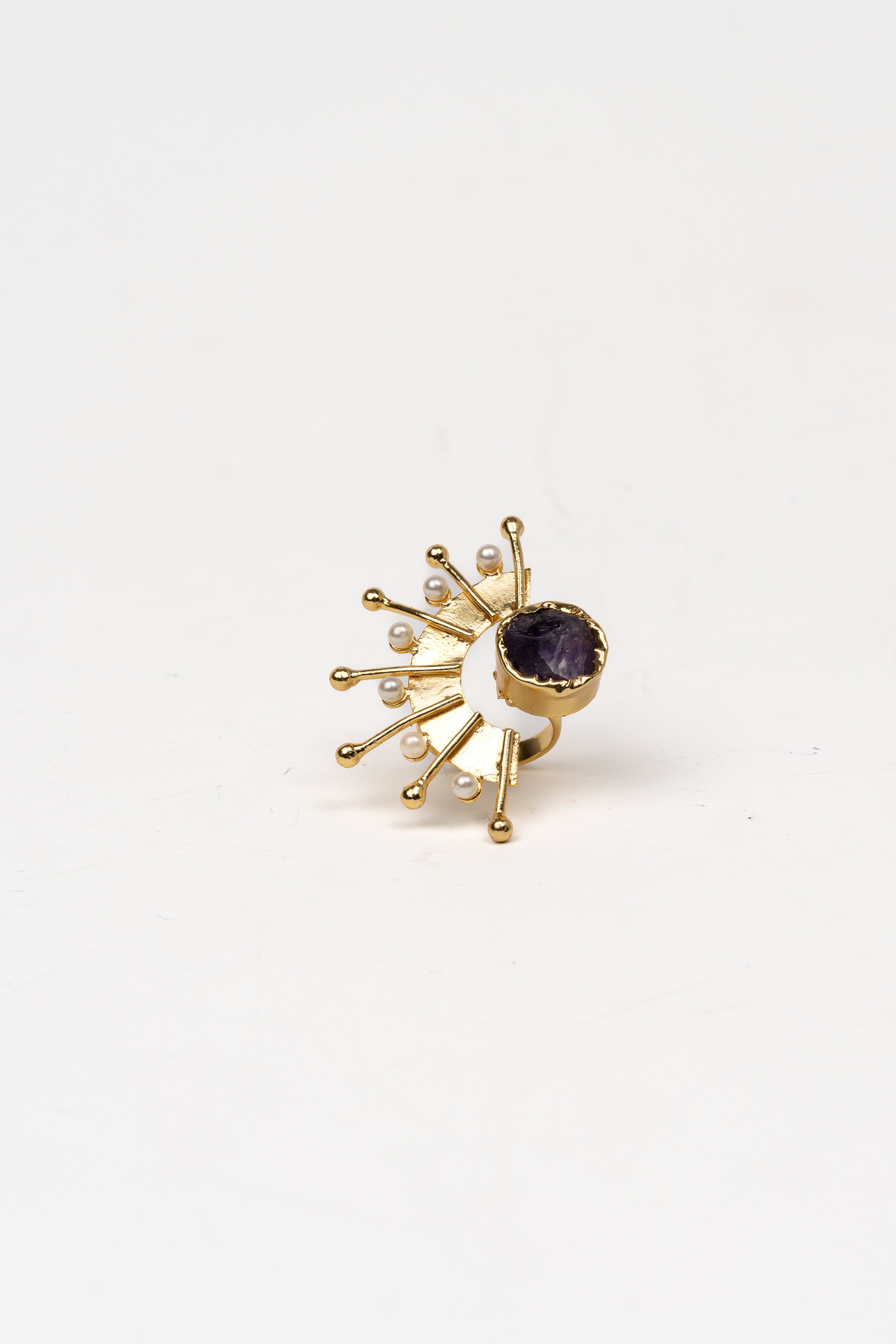 Anillo de acero inoxidable dorado con piedra morada en bruto y detalles en forma de rayos con perlas, ajustable.