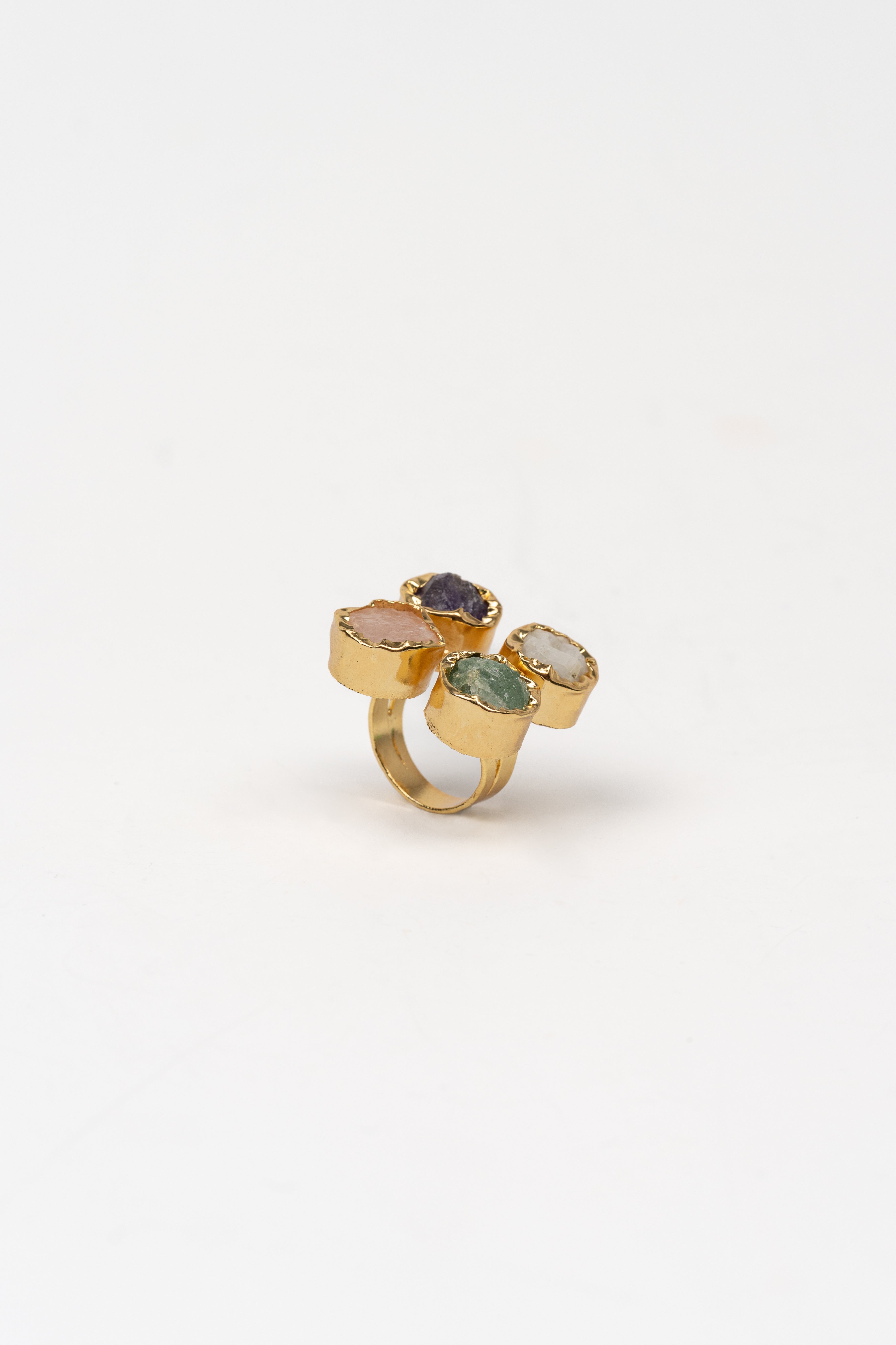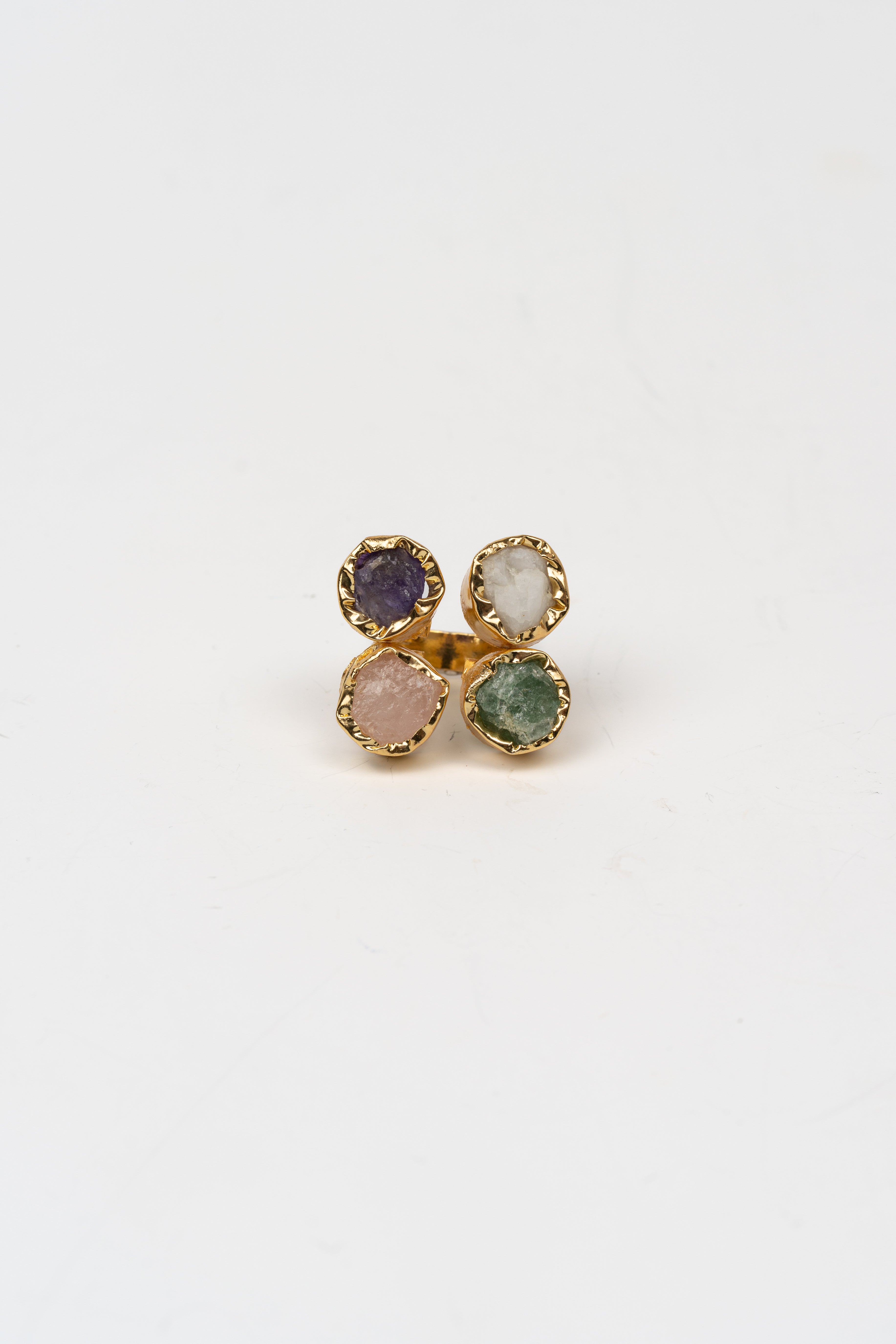 Anillo de acero inoxidable dorado con cuatro piedras en bruto en tonos rosa, negro, blanco y verde, con diseño ajustable.