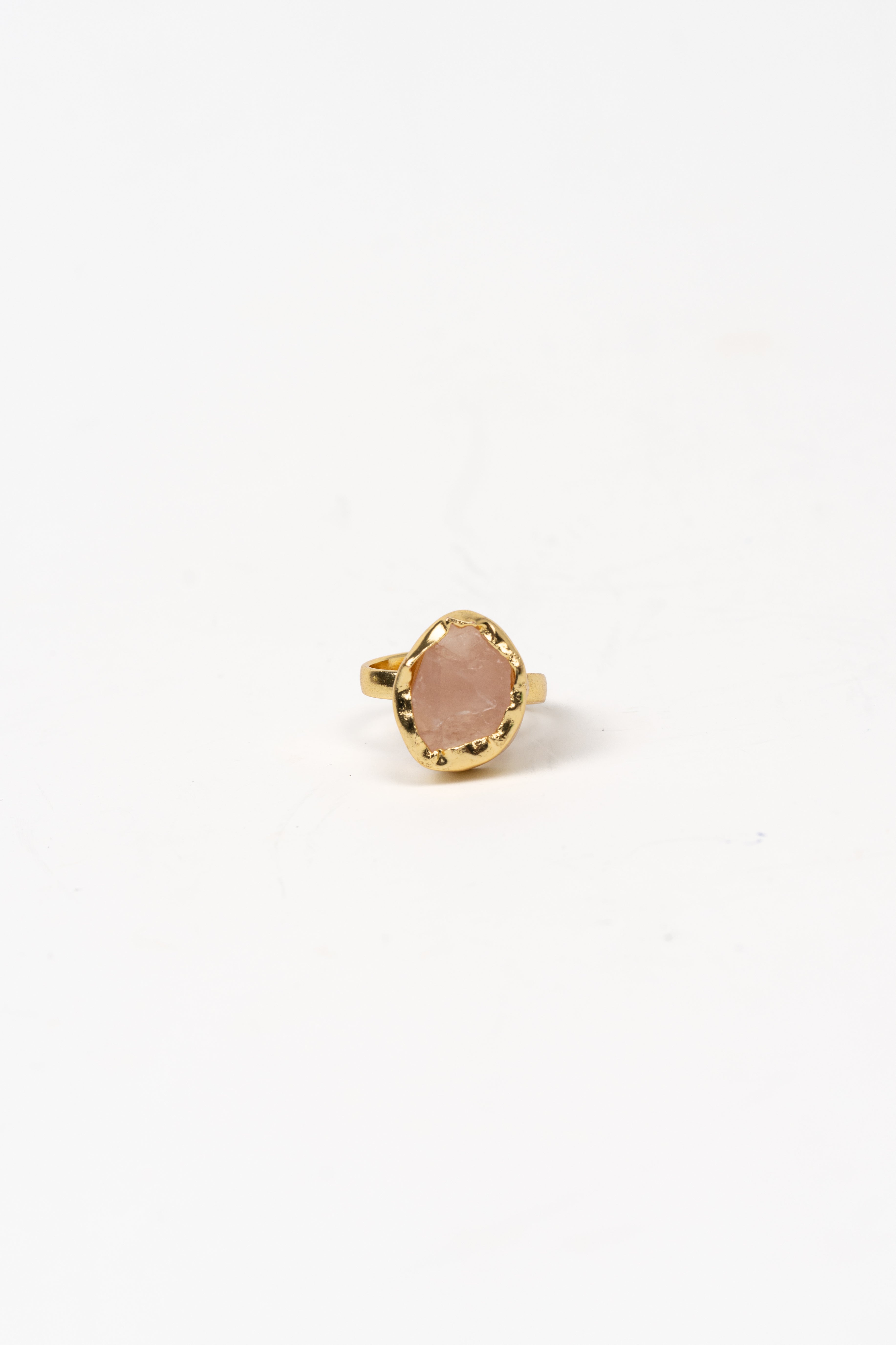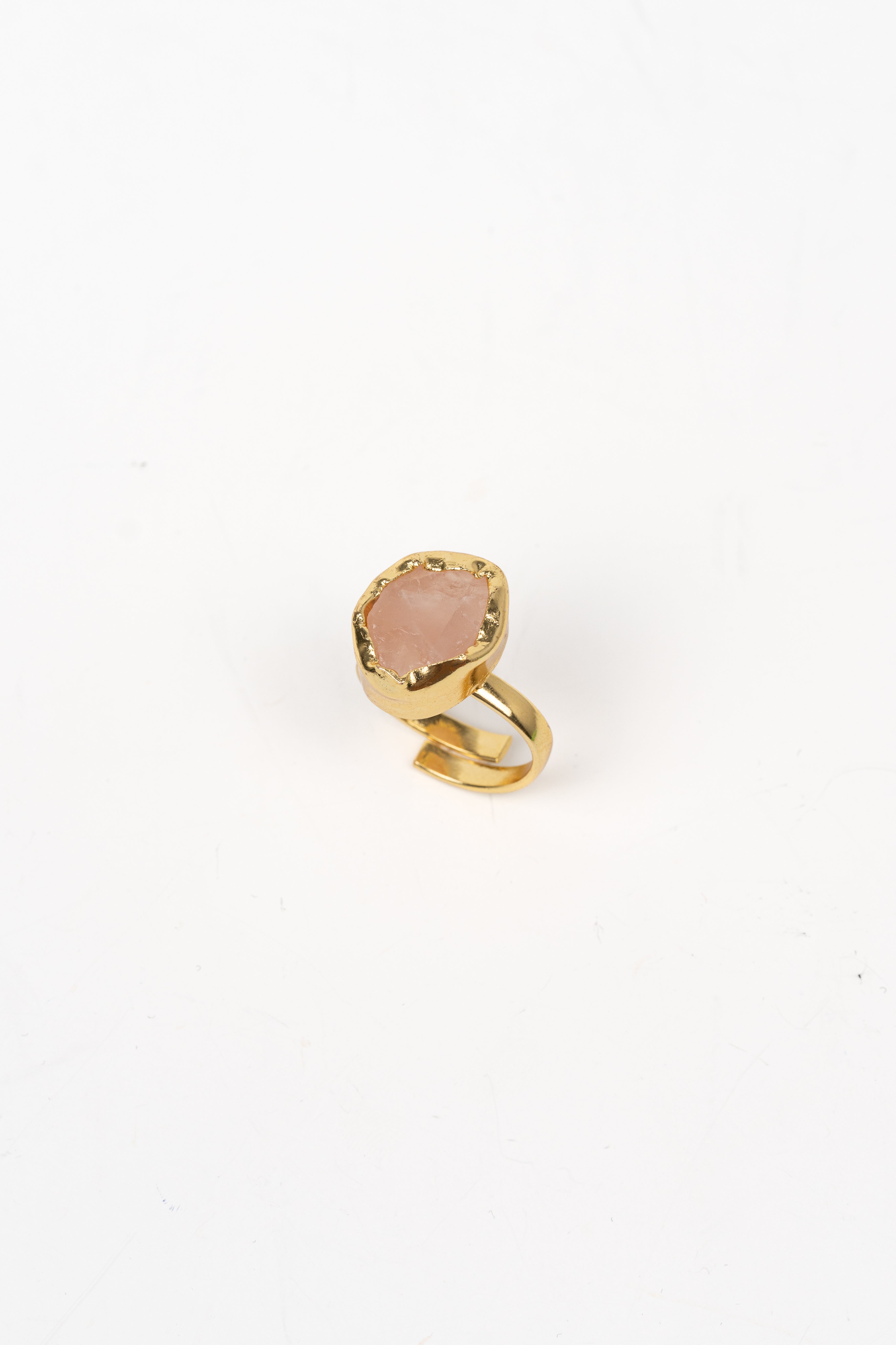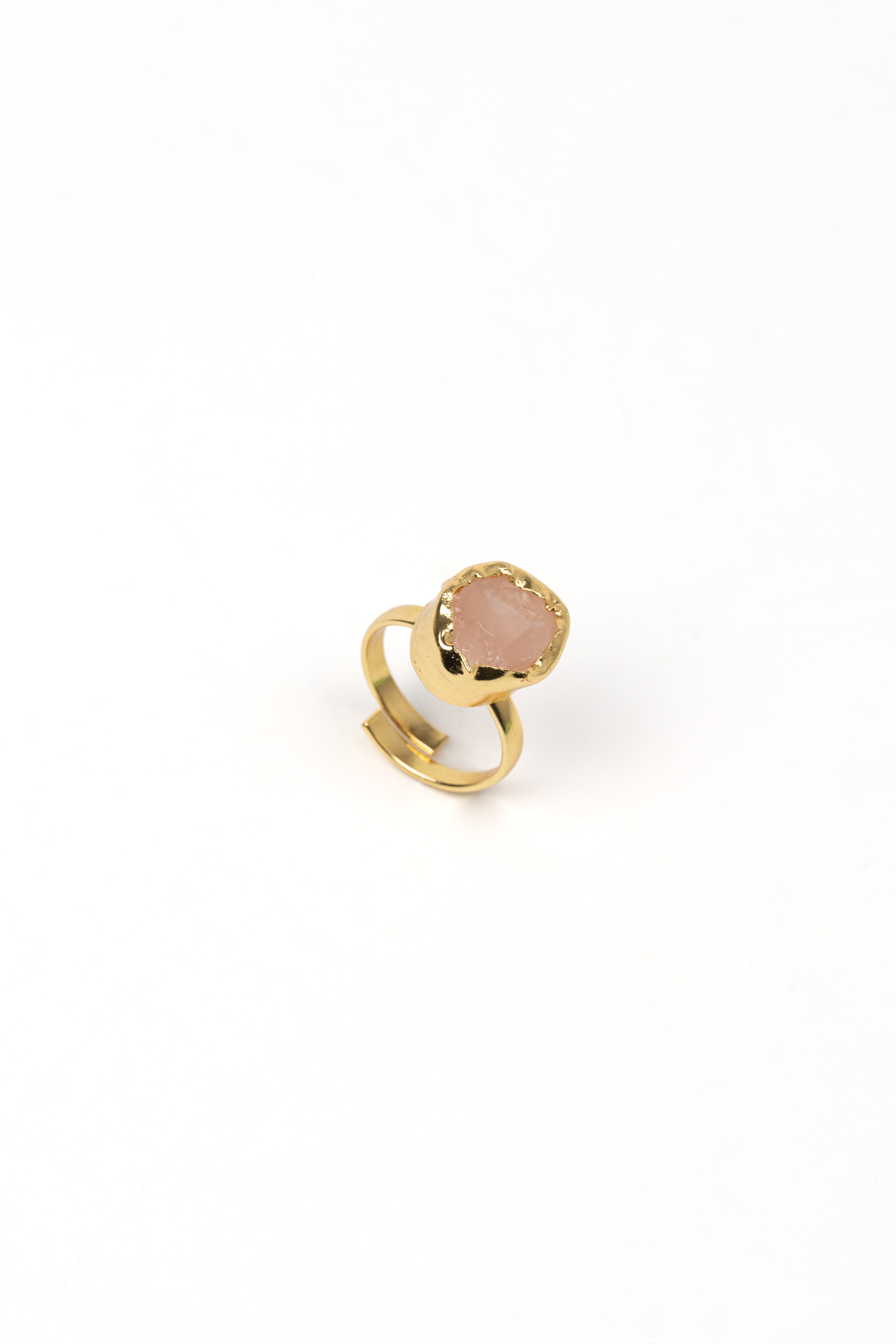 Anillo de acero inoxidable dorado con piedra rosa en bruto y diseño ajustable.