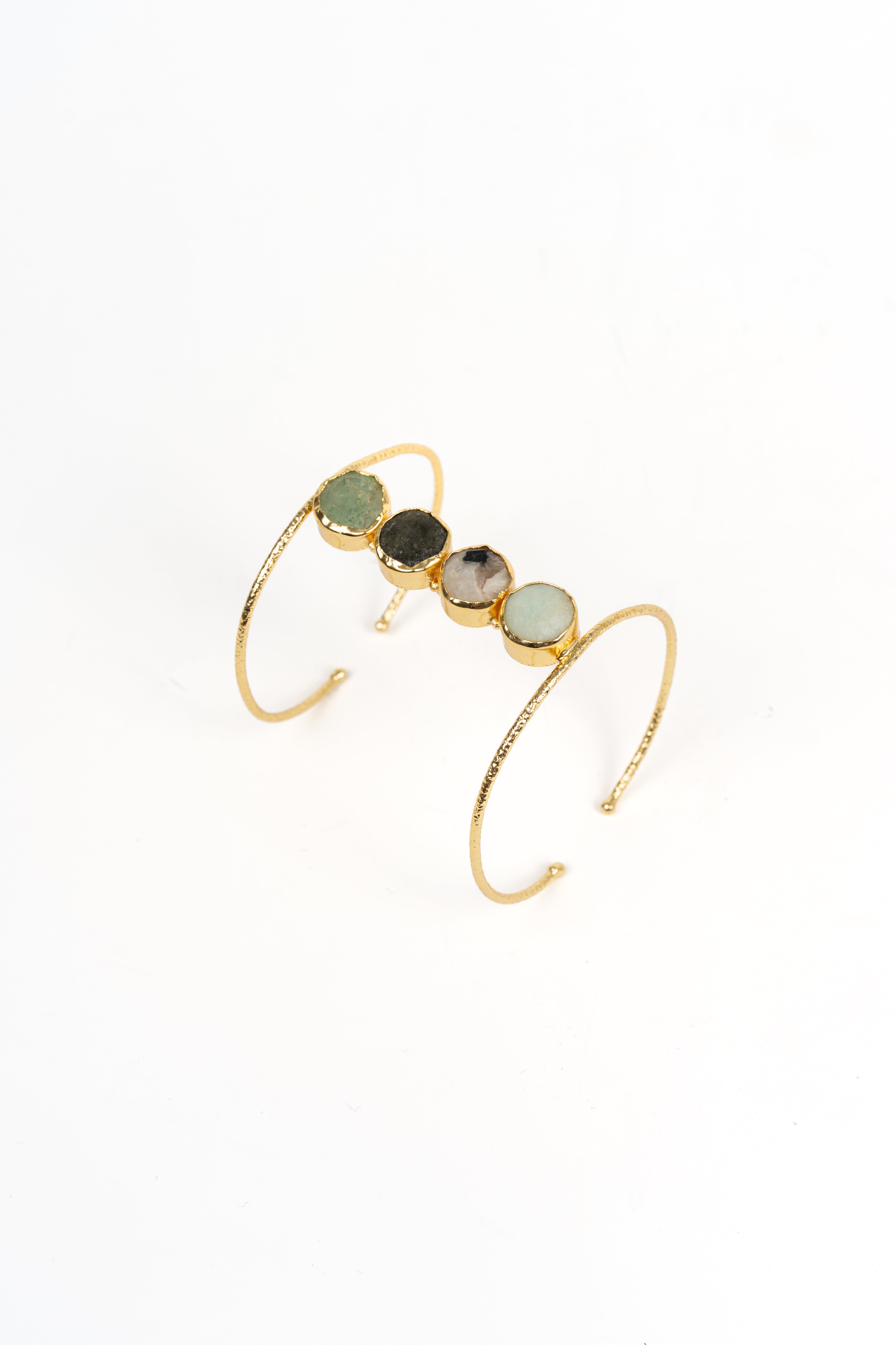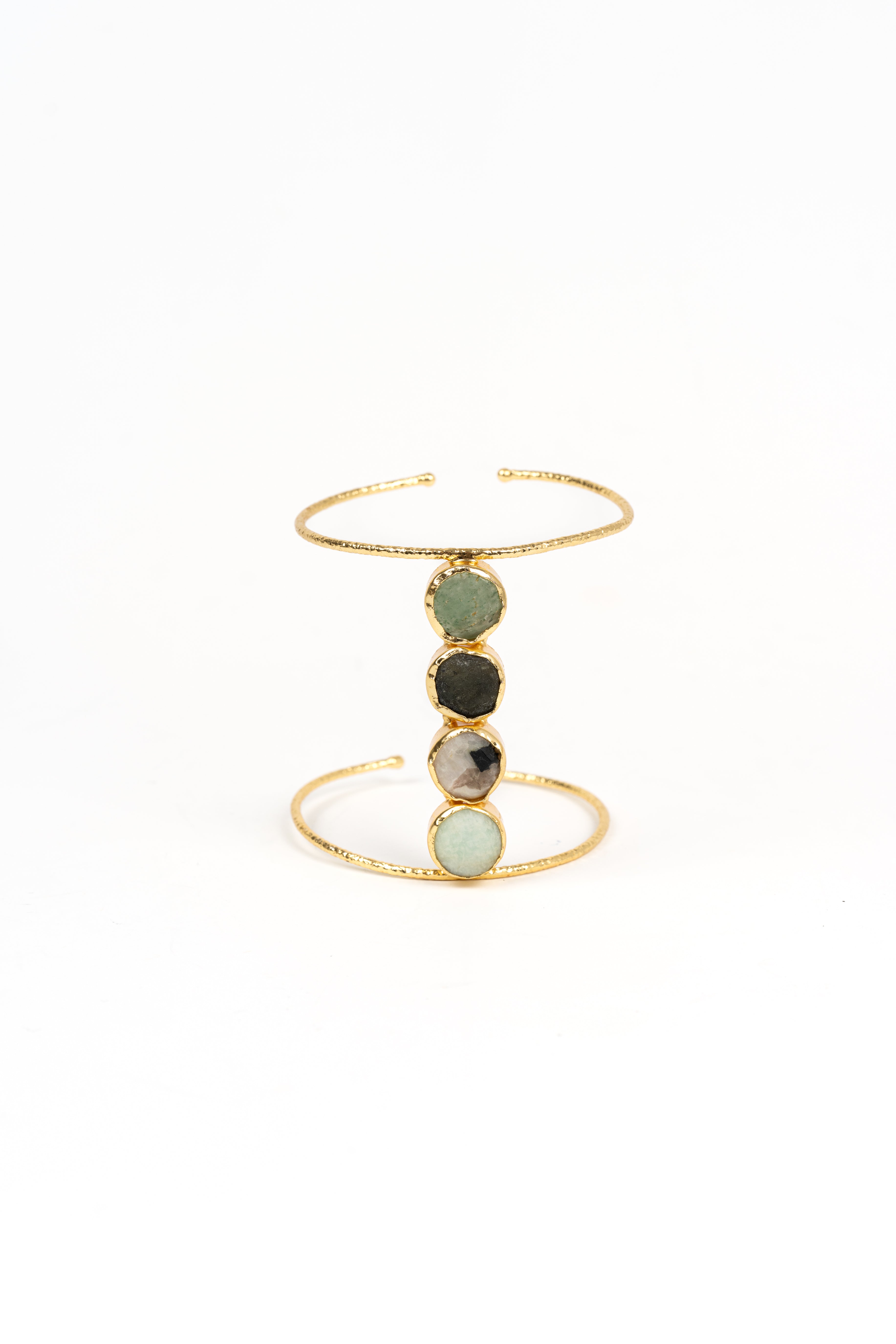 Brazalete dorado abierto con doble aro fino y cuatro piedras naturales en tonos verdes y grisáceos engastadas en la parte superior.
