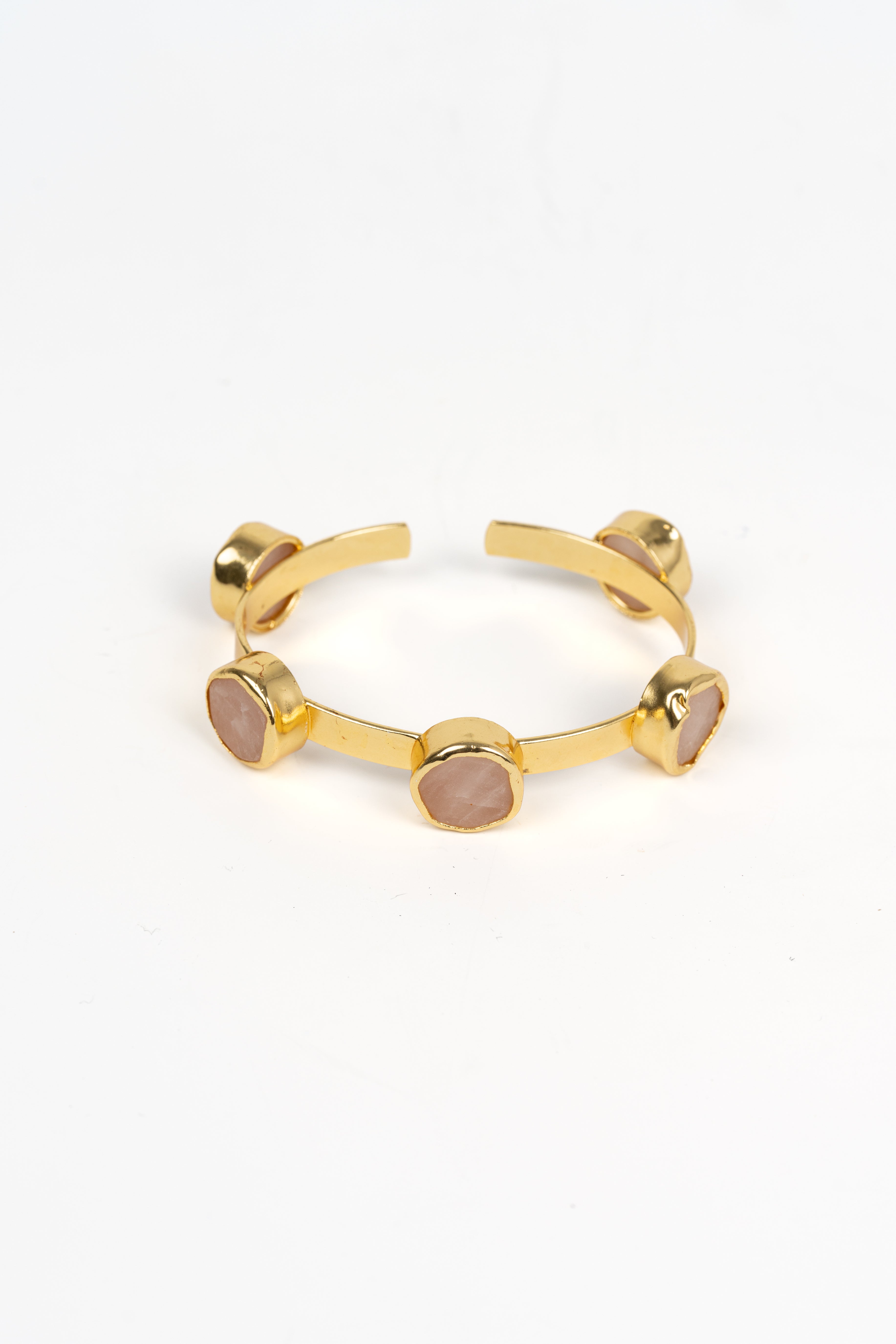 Brazalete dorado abierto con cinco piedras naturales rosadas engastadas en estructura lineal.