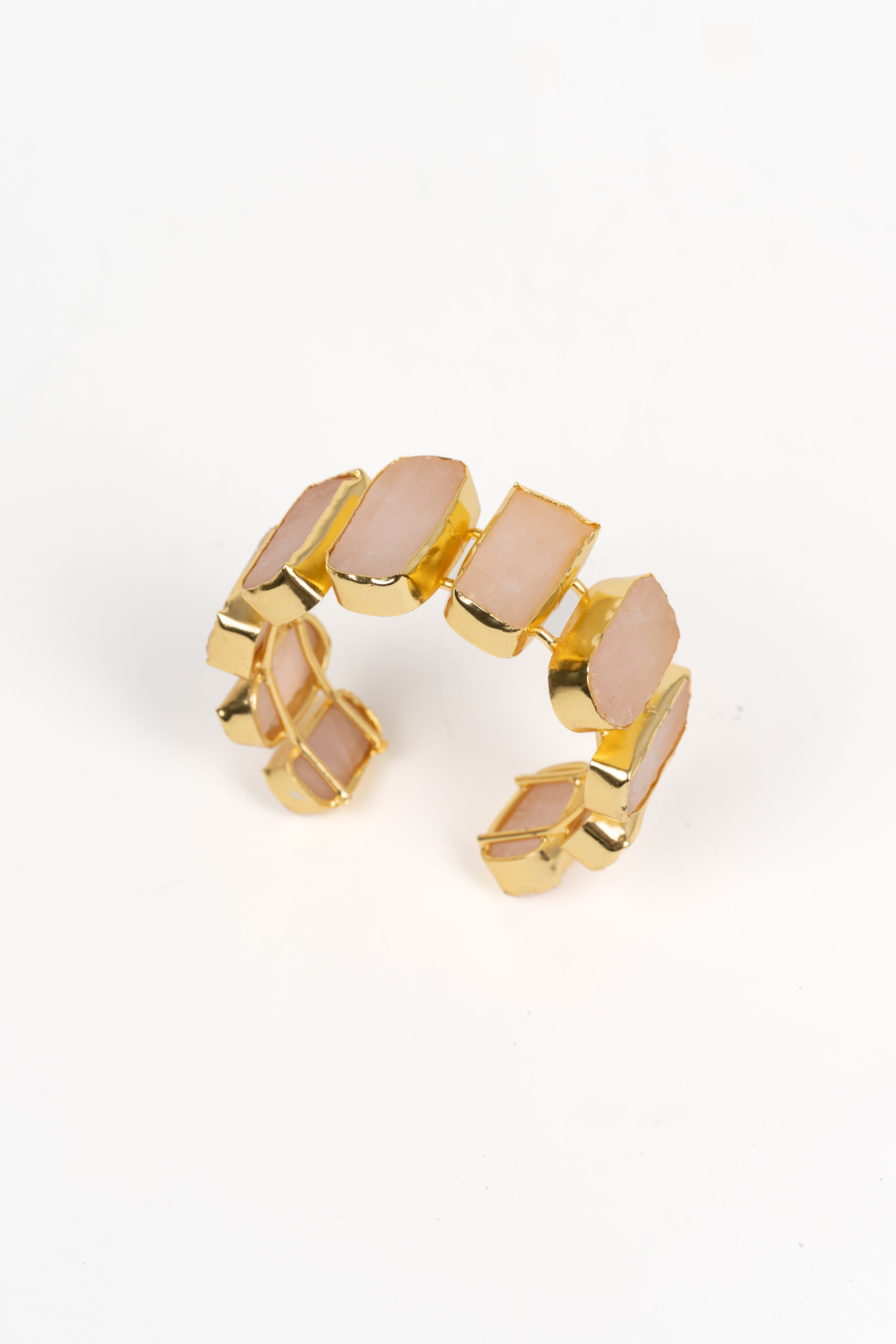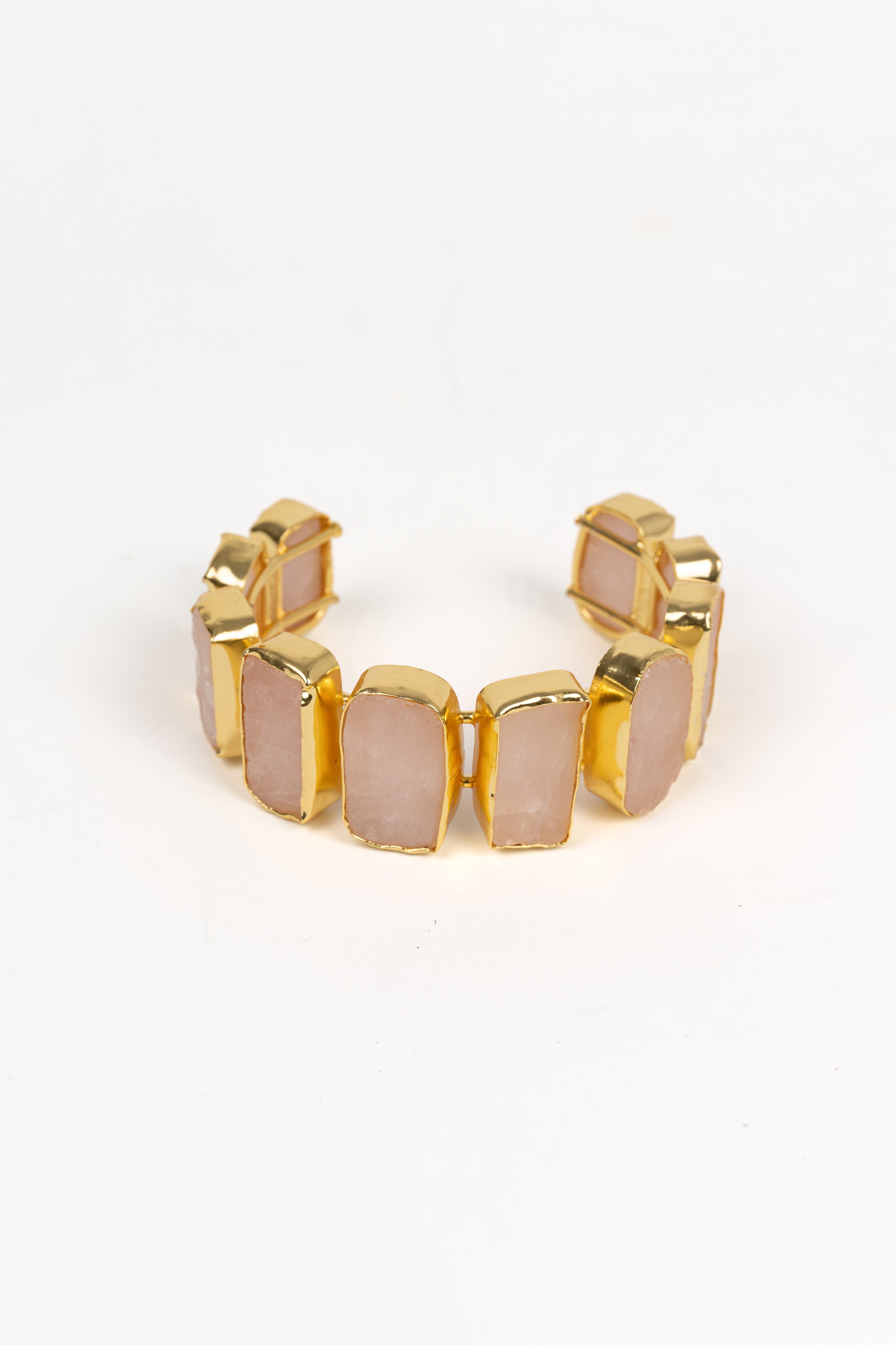 Brazalete dorado de diseño abierto formado por múltiples piedras rectangulares rosa montadas en estructura articulada.