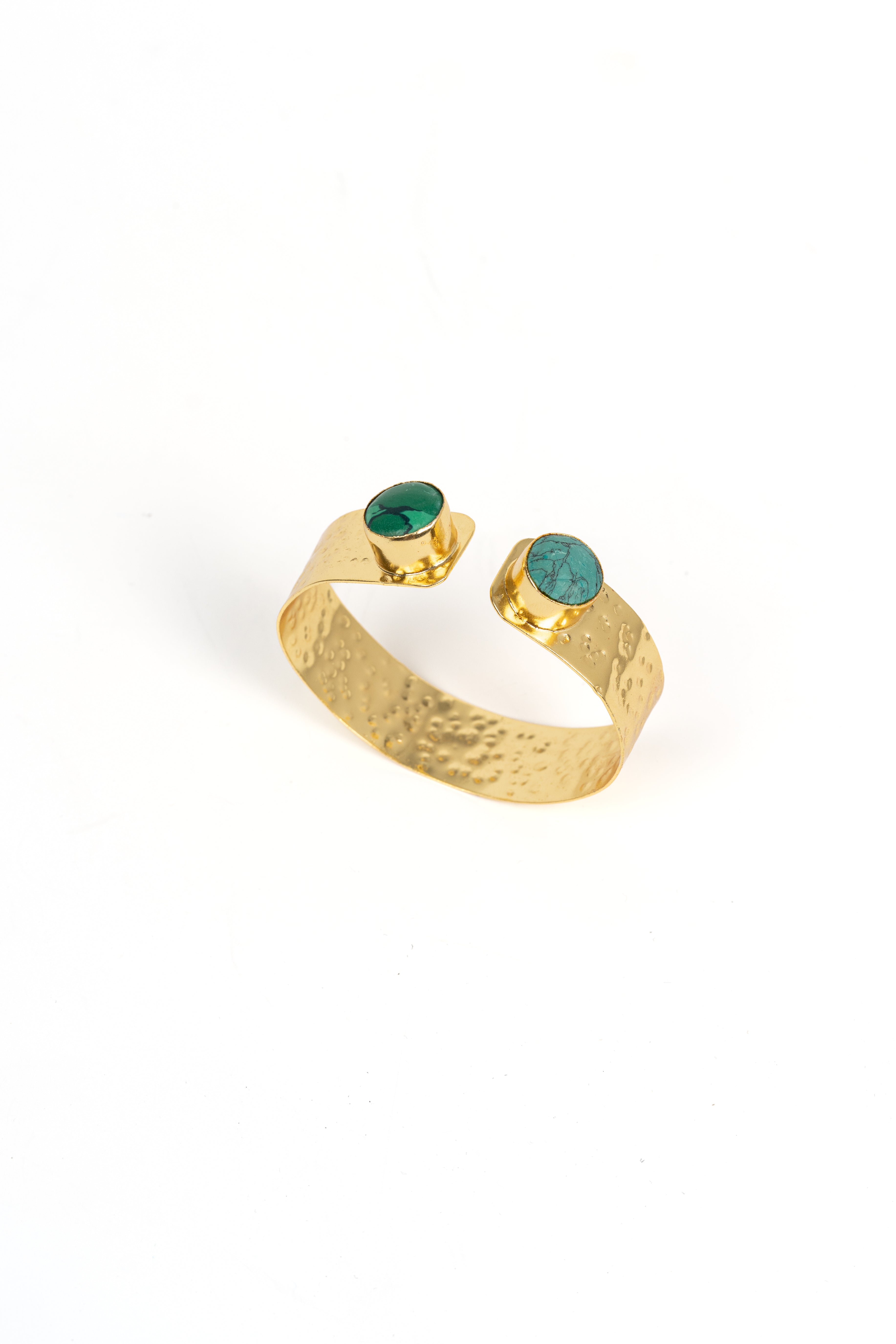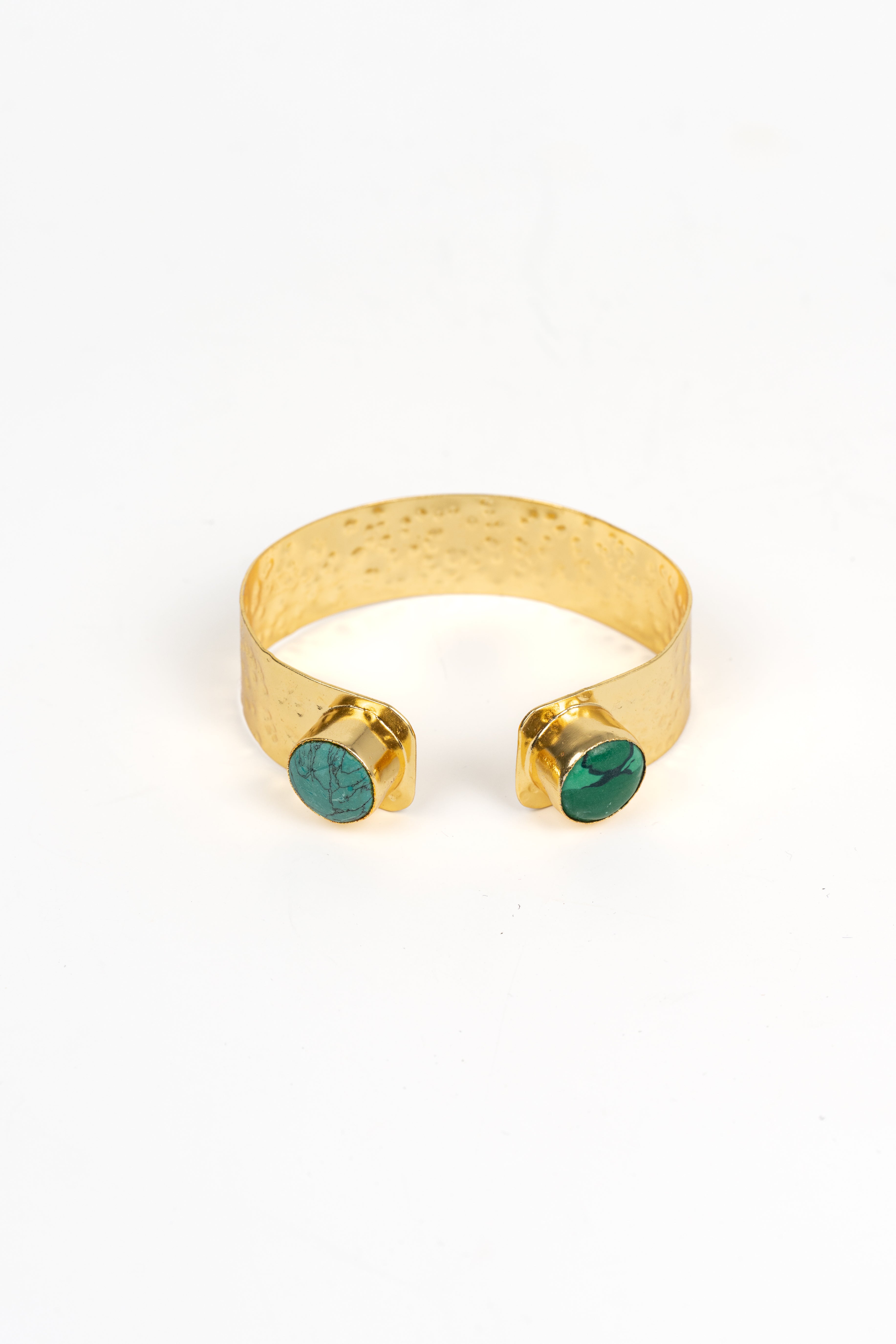 Brazalete de acero inoxidable dorado con acabado martelé y dos piedras verdes en los extremos.