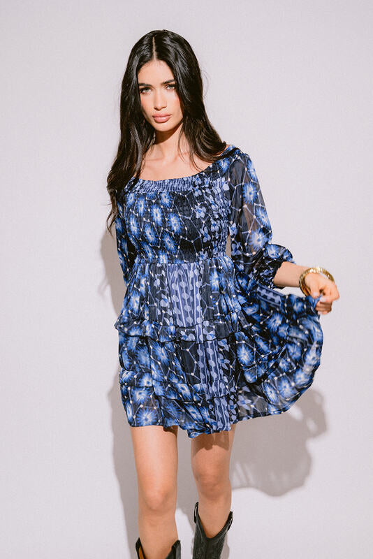 Vestido corto en azul y negro con estampado geométrico, escote recto con fruncido y cintura elástica para un estilo boho fresco y versátil.