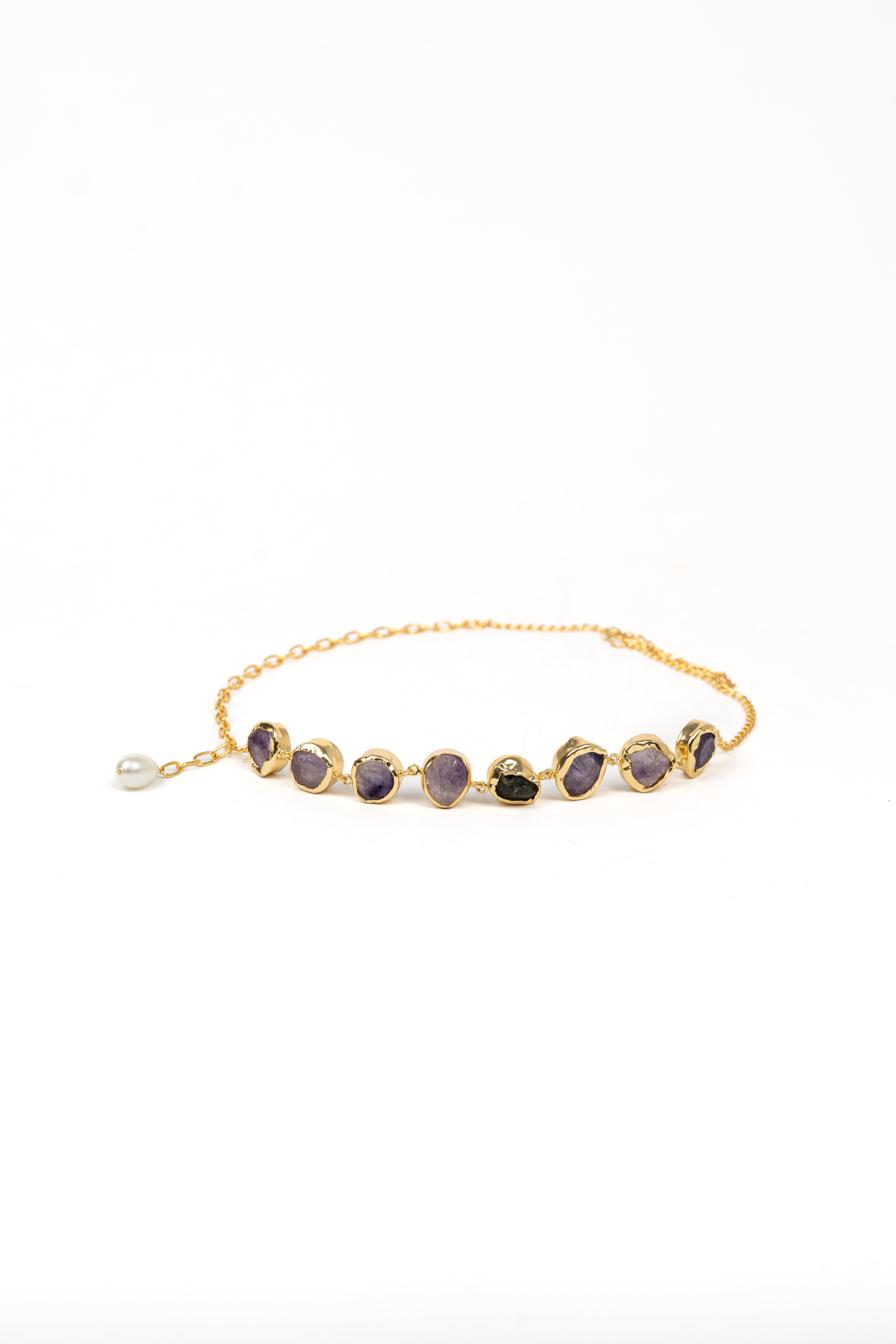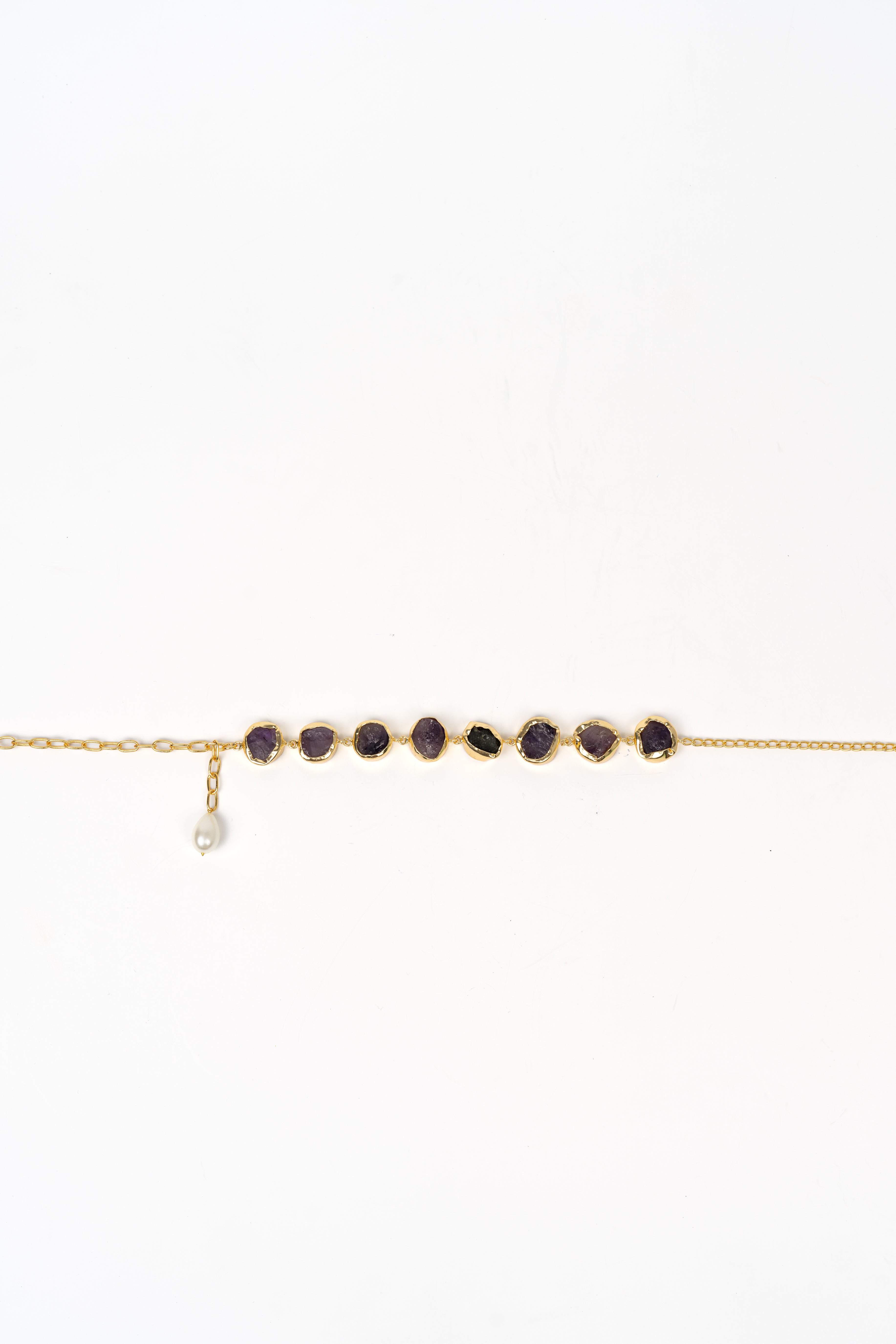 Gargantilla dorada con pequeñas piedras en tonos malva engastadas de forma orgánica, unidas por delicados eslabones y rematada con una cuenta perlada.