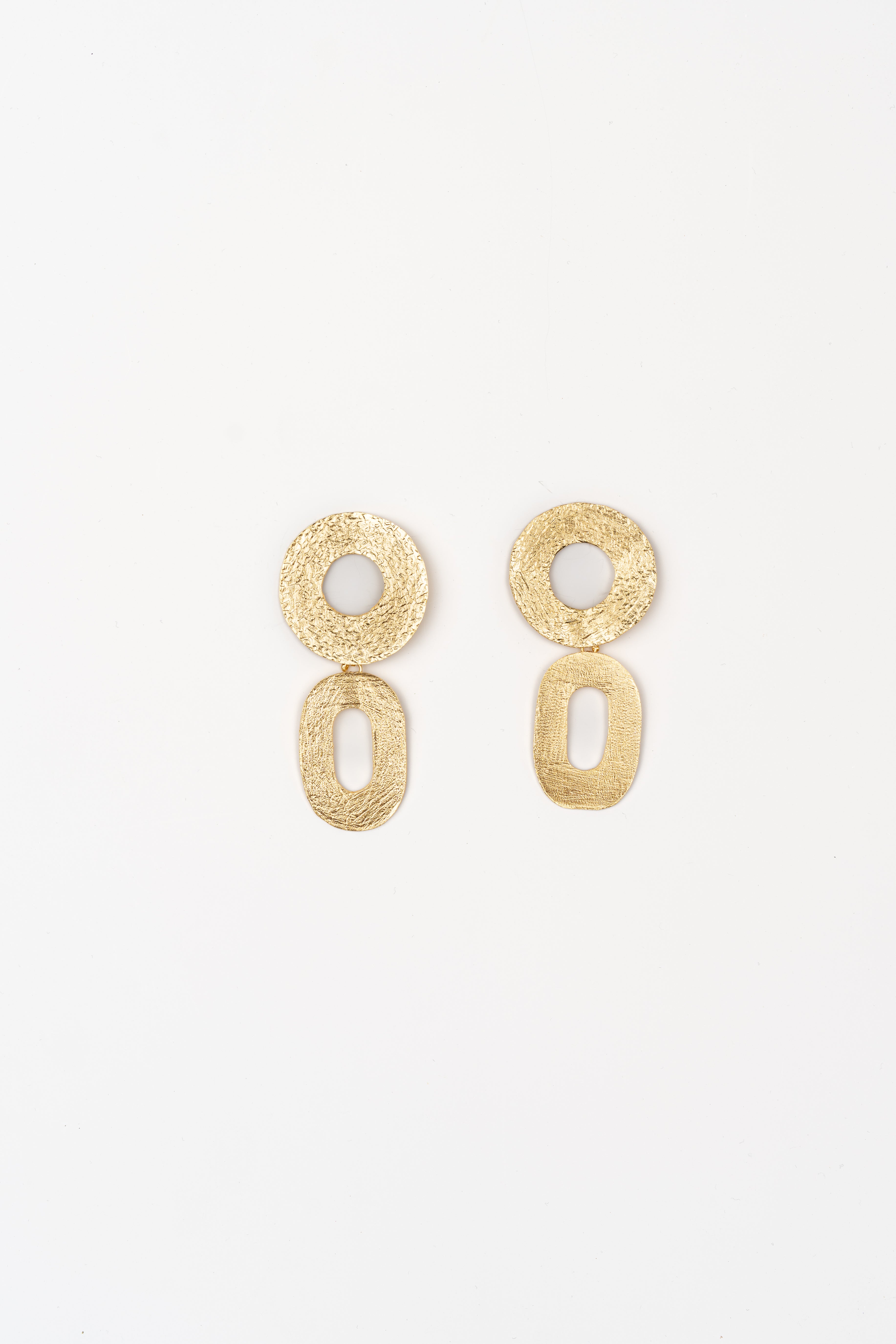 Pendientes de acero inoxidable dorado con aro circular y pieza ovalada colgante, ambos con textura martillada.