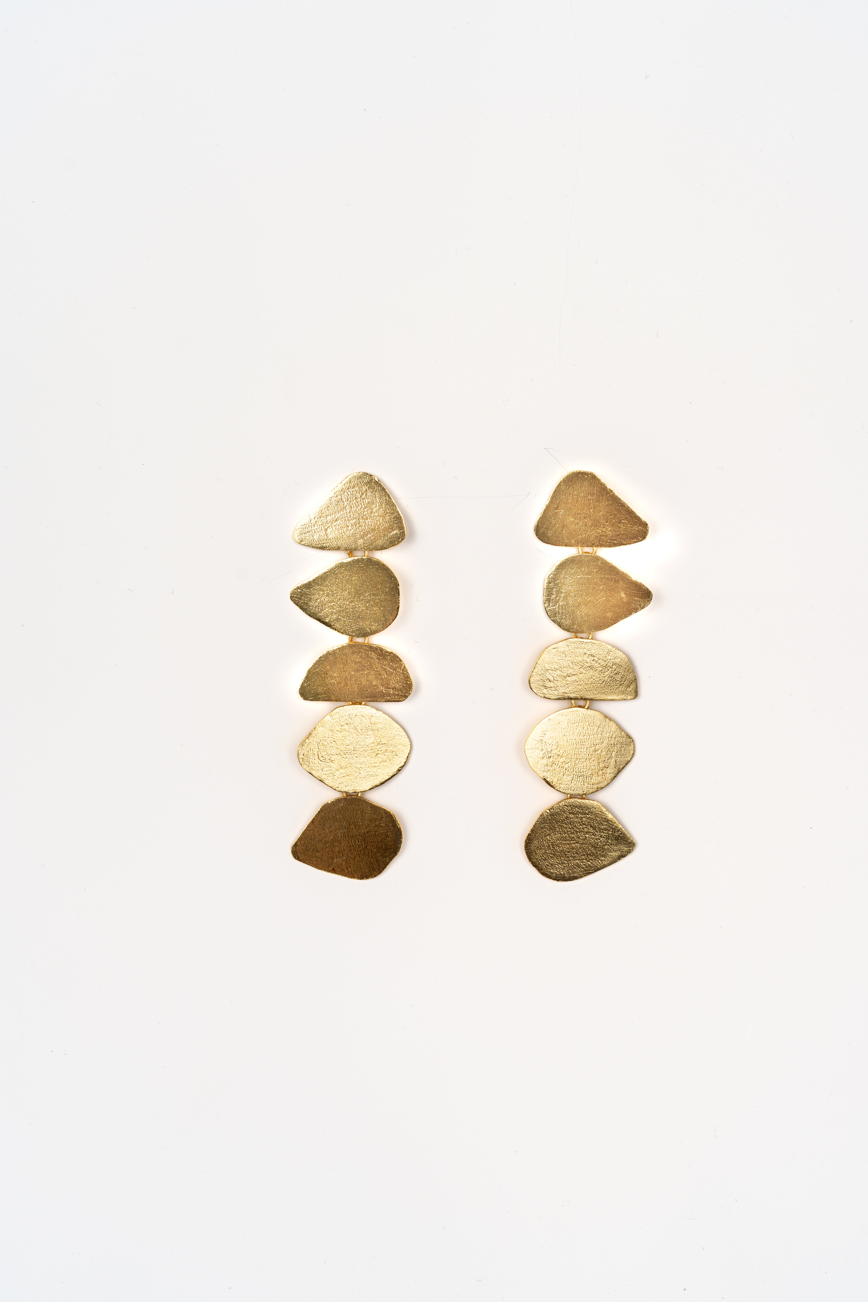 Pendientes de acero inoxidable dorado con piezas geométricas texturizadas en diseño vertical.