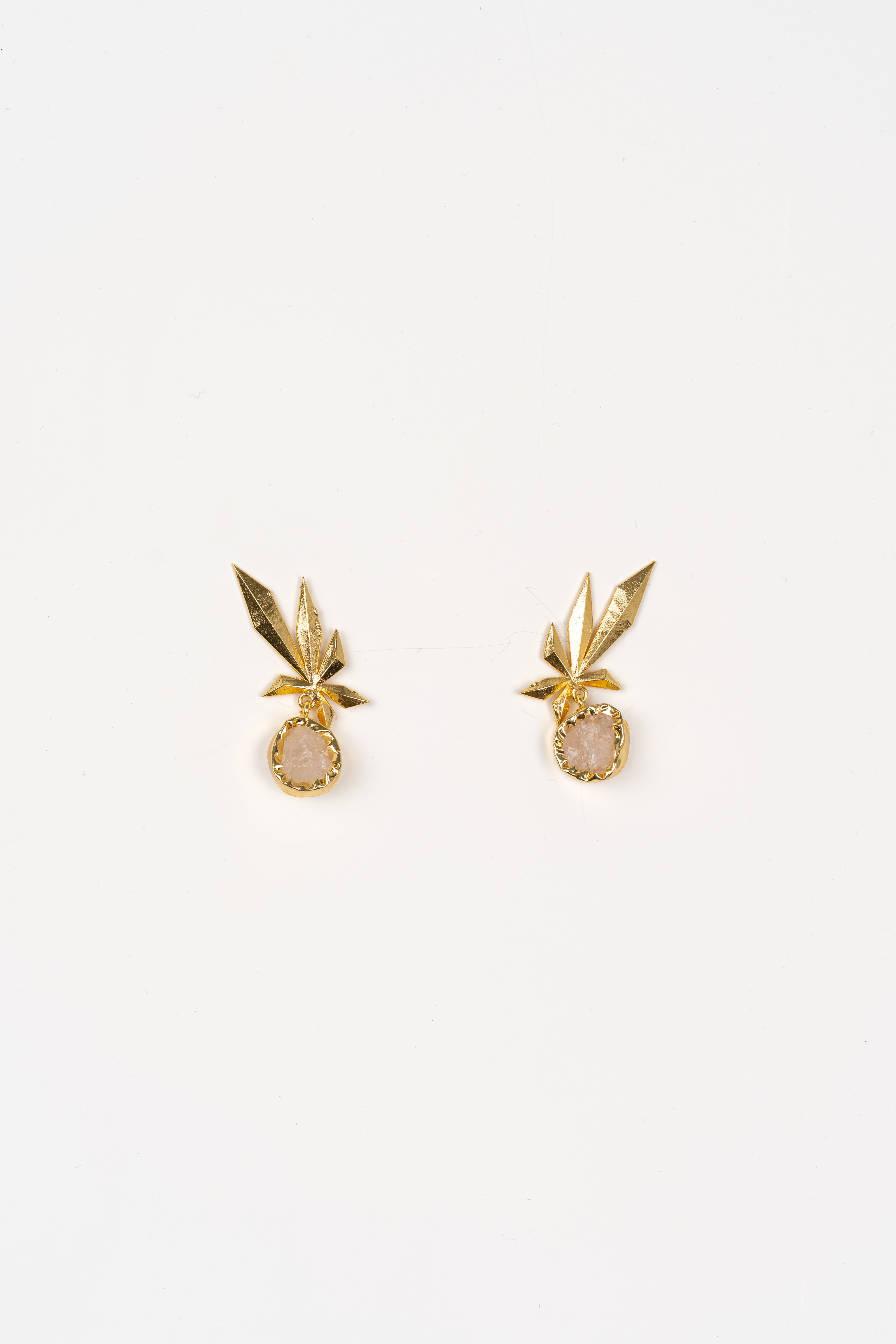 Pendientes de acero inoxidable dorado con hojas geométricas y piedra rosa en bruto colgante.