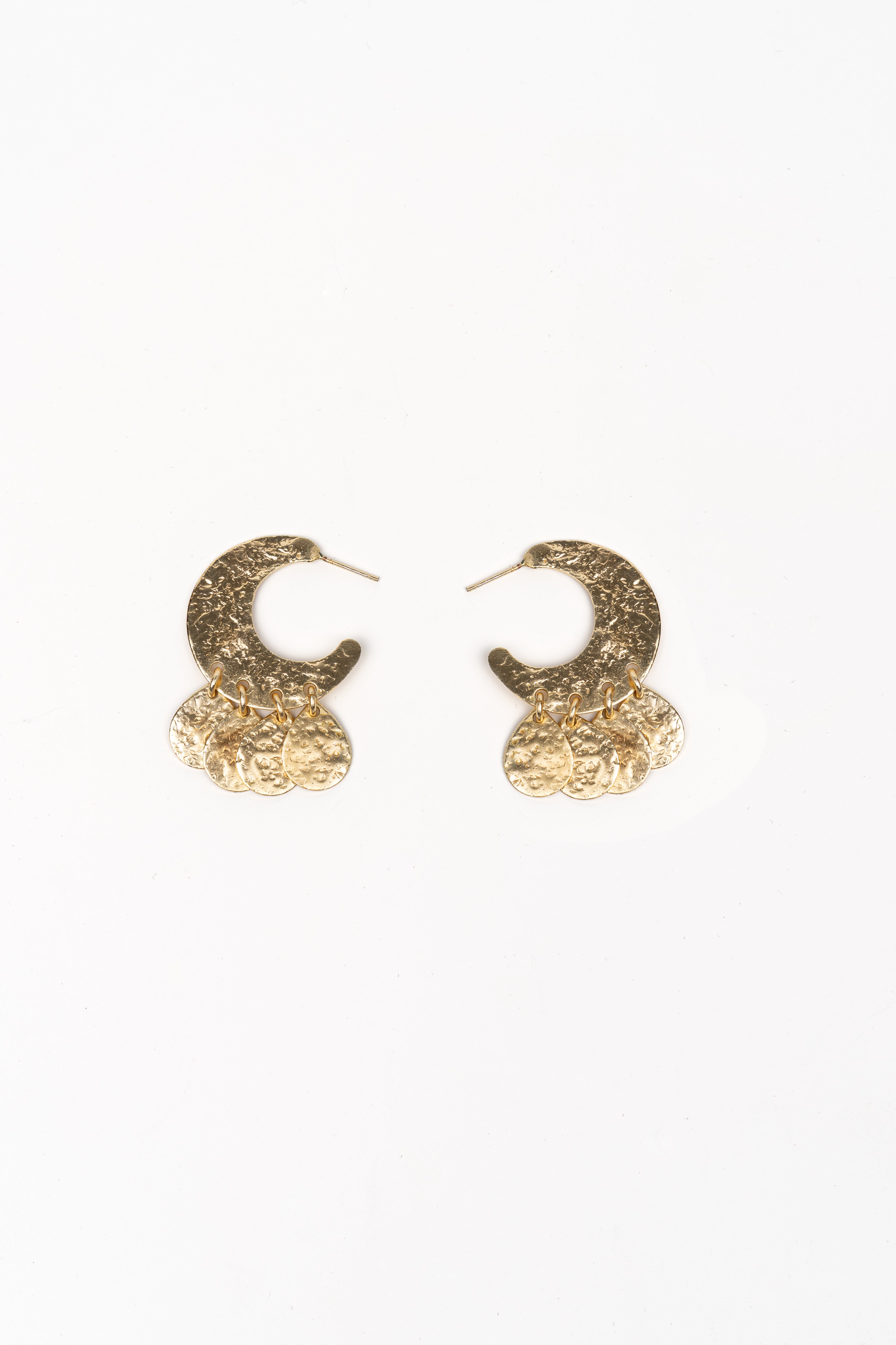 Pendientes de acero inoxidable dorado con aro en forma de luna y colgantes circulares texturizados.