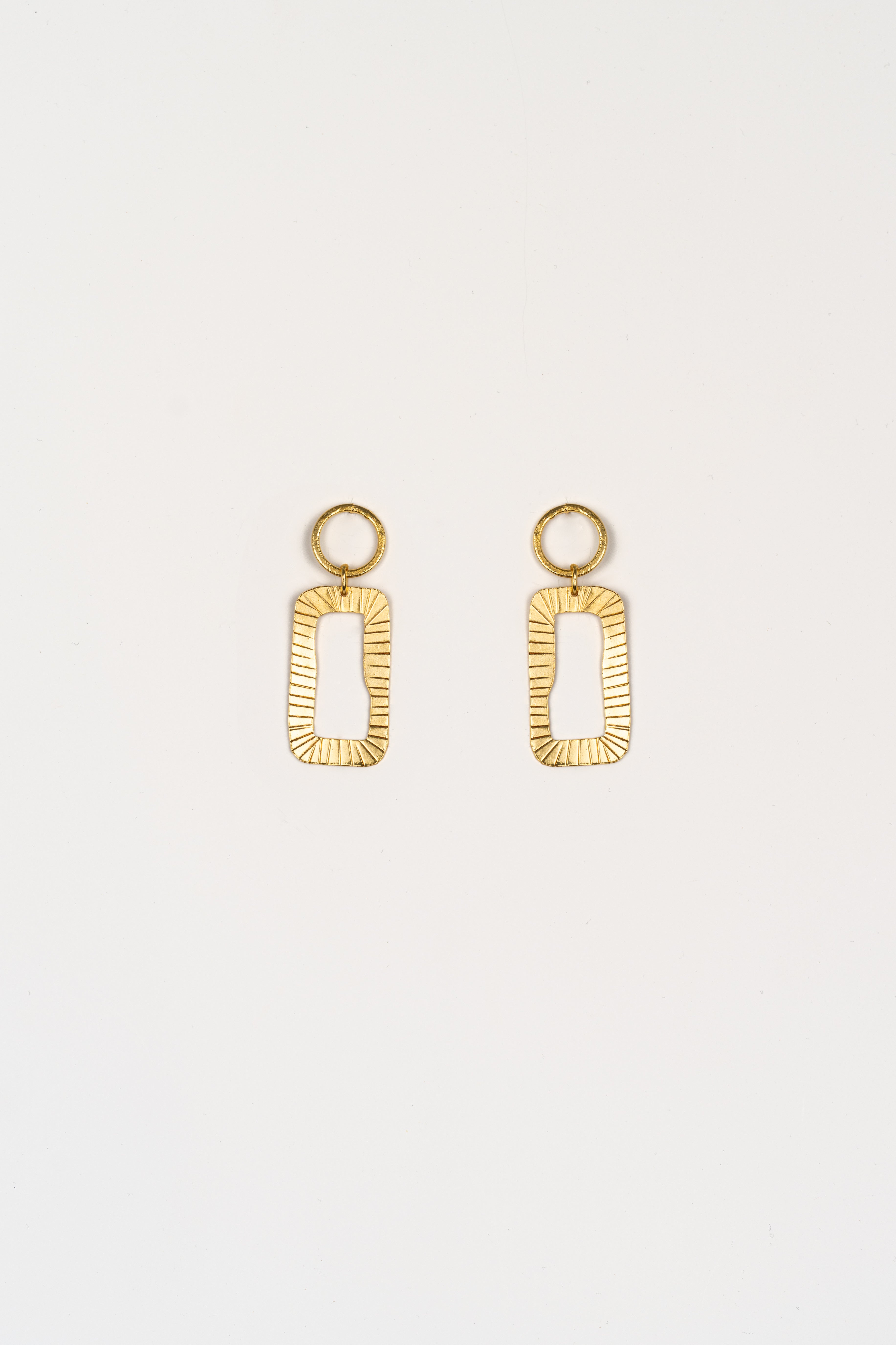 Pendientes de acero inoxidable dorado con aro superior y pieza rectangular calada con líneas grabadas.