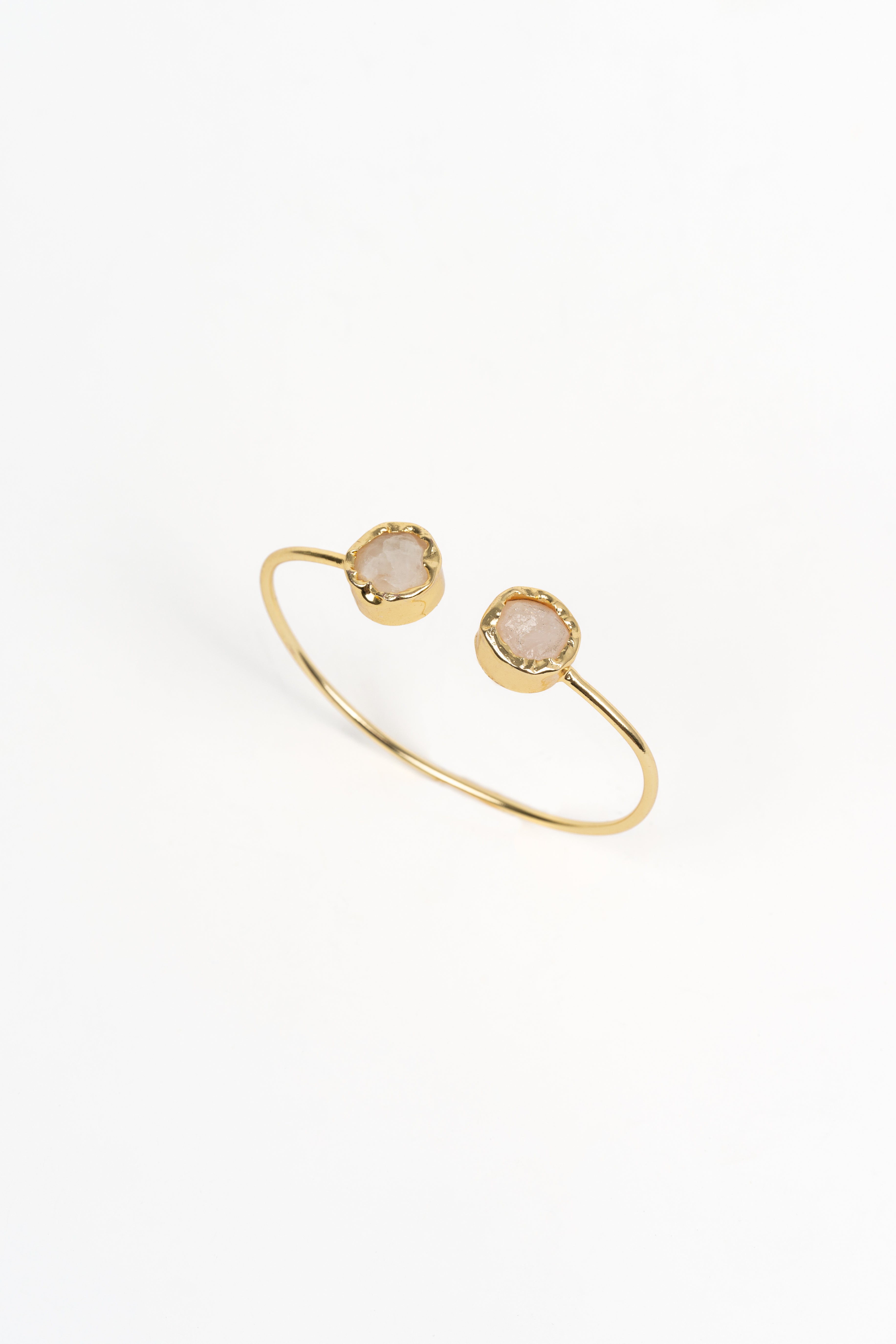Pulsera abierta de acero inoxidable dorado con dos piedras rosa en engaste orgánico en los extremos.