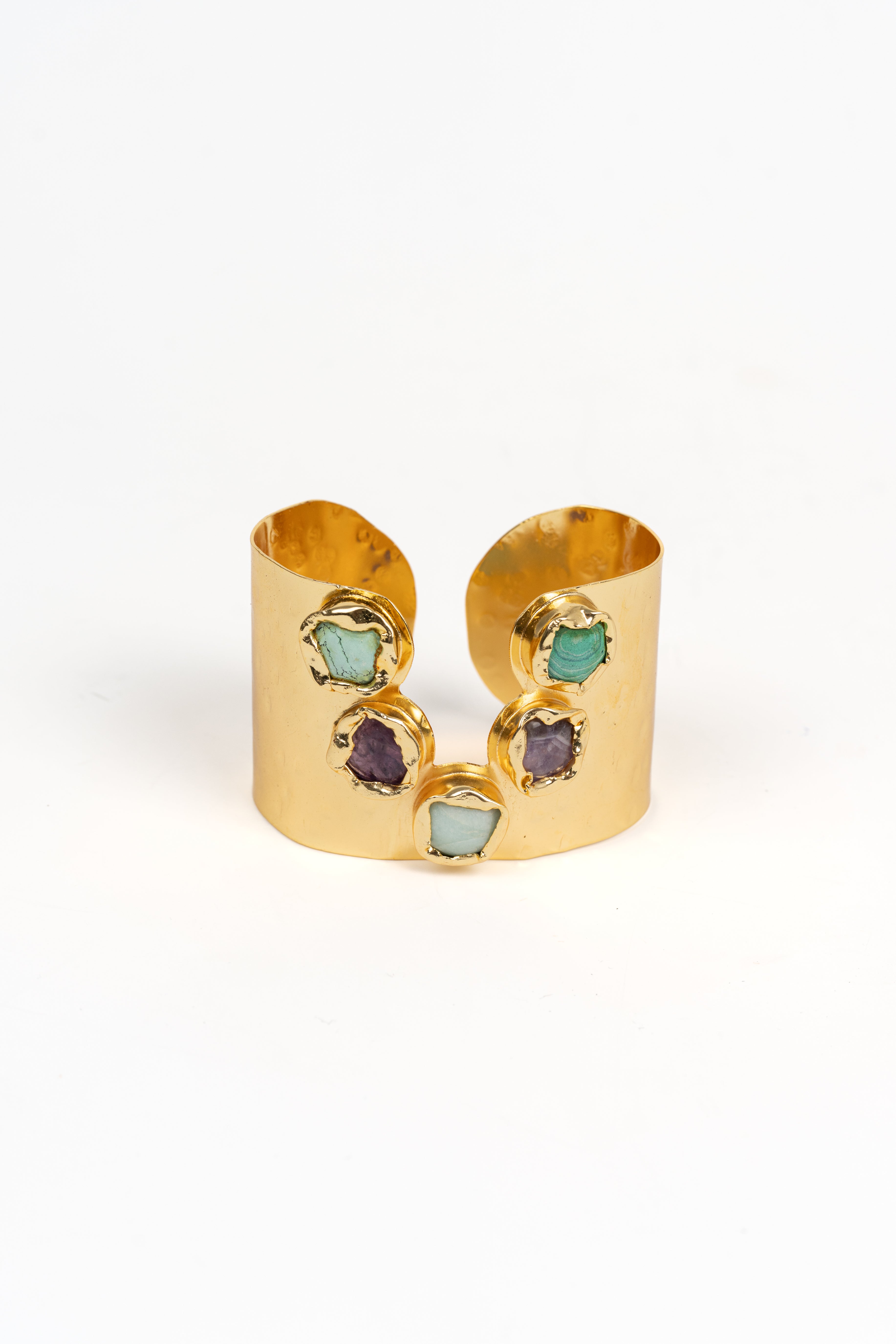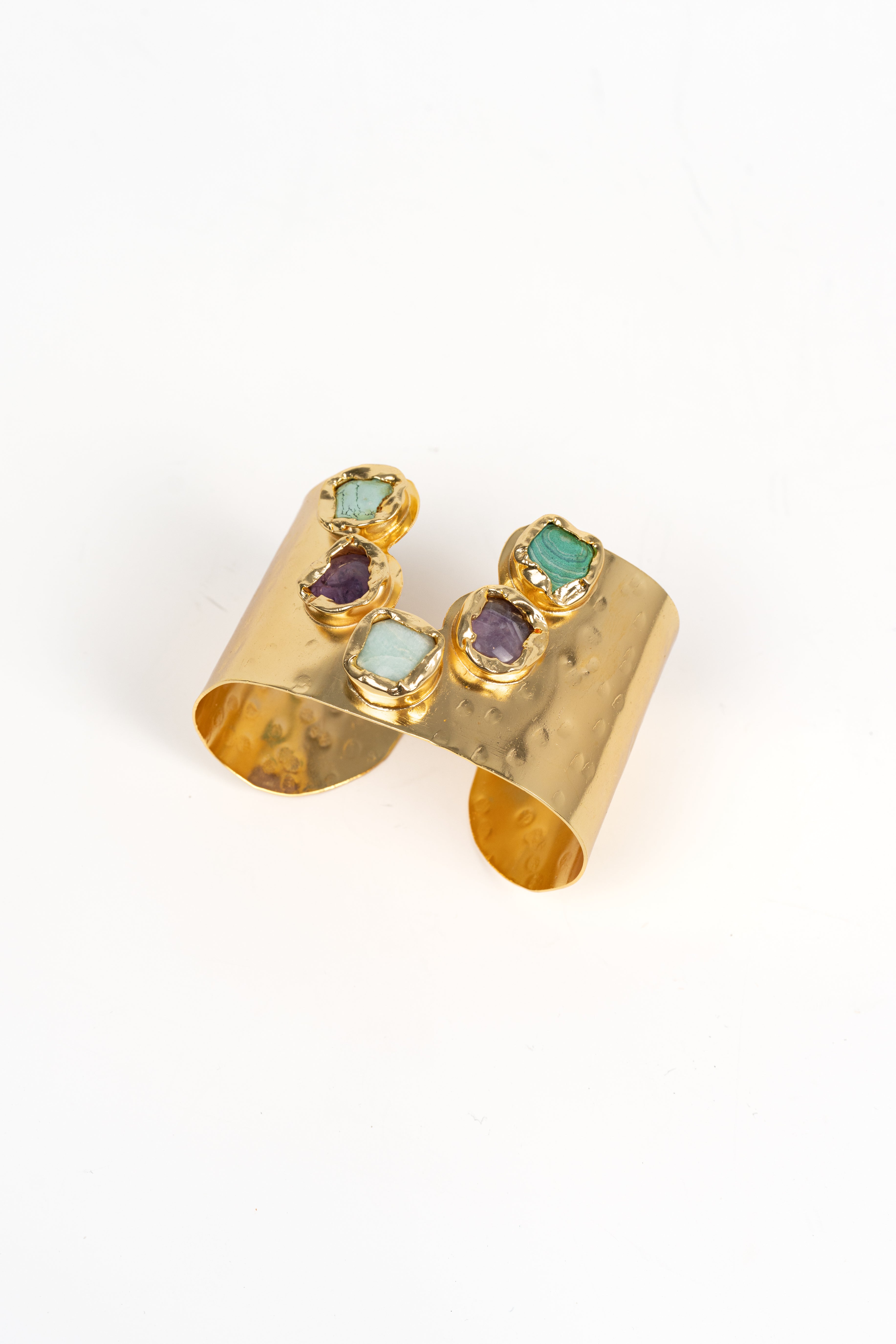 Pulsera dorada abierta decorada con varias piedras naturales en tonos verde y morado.