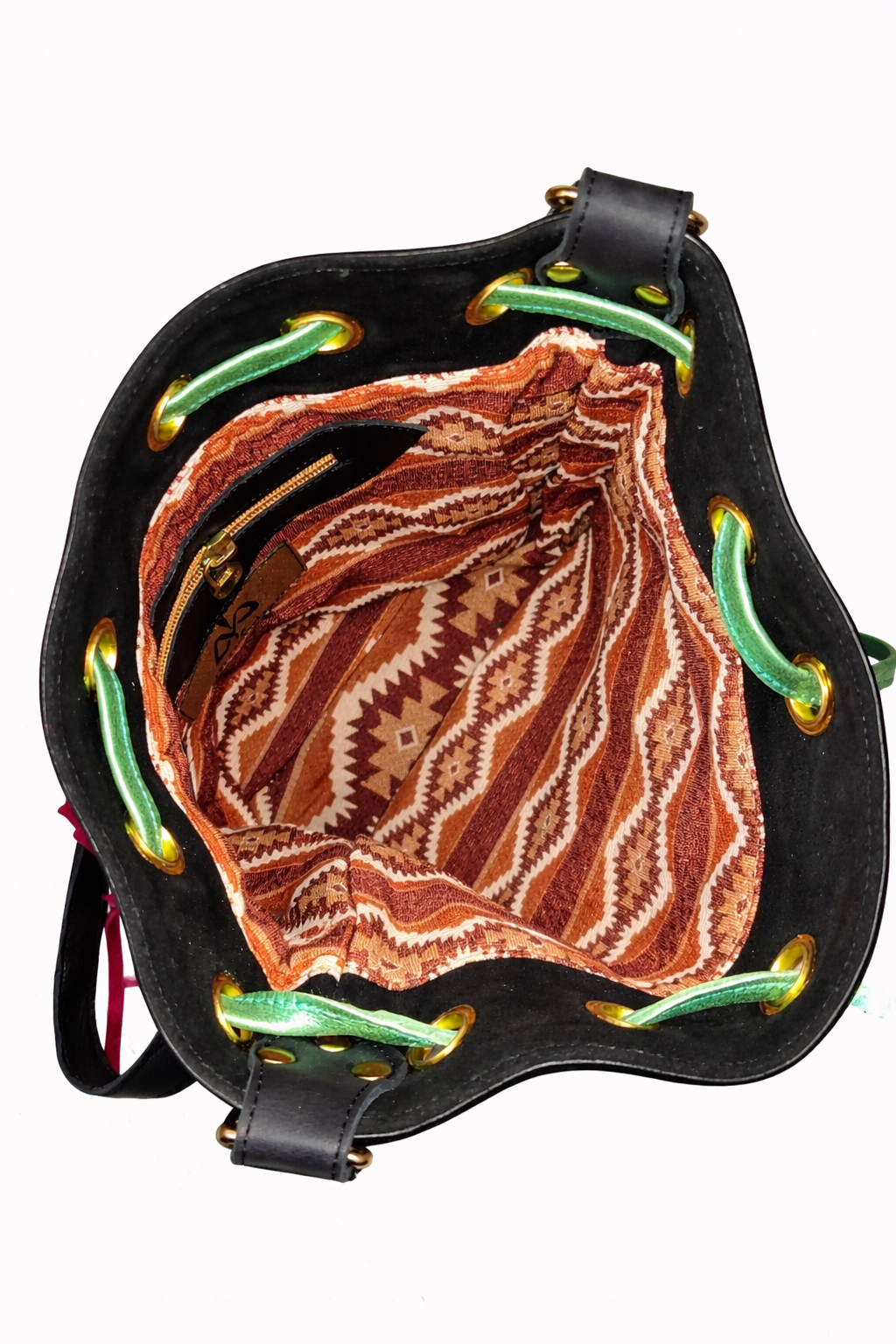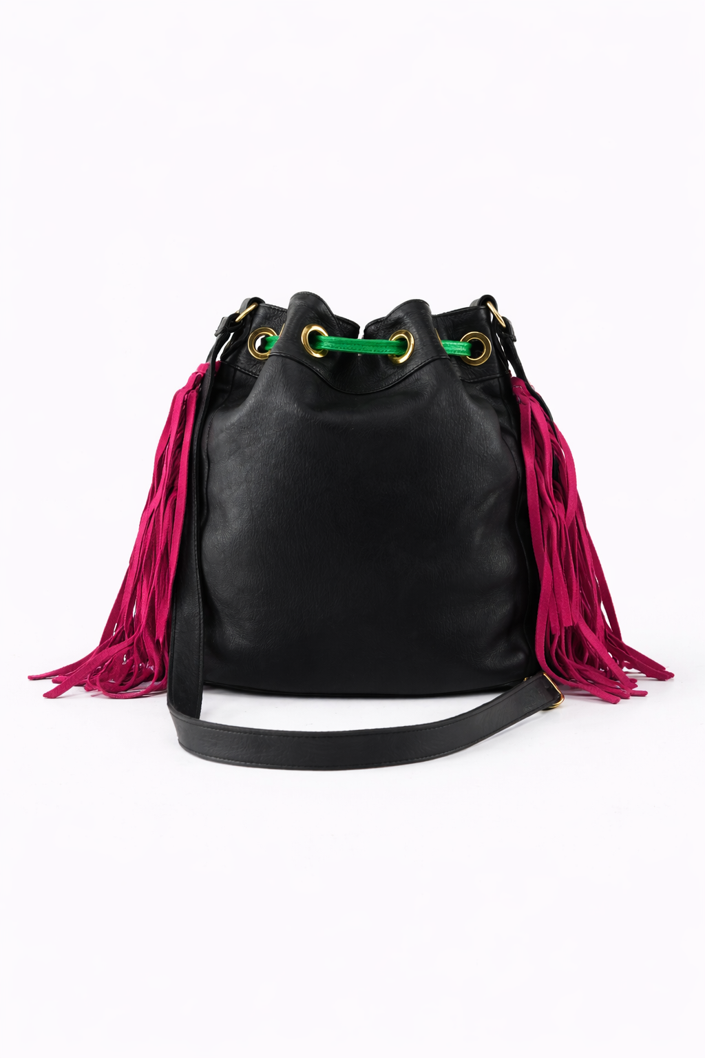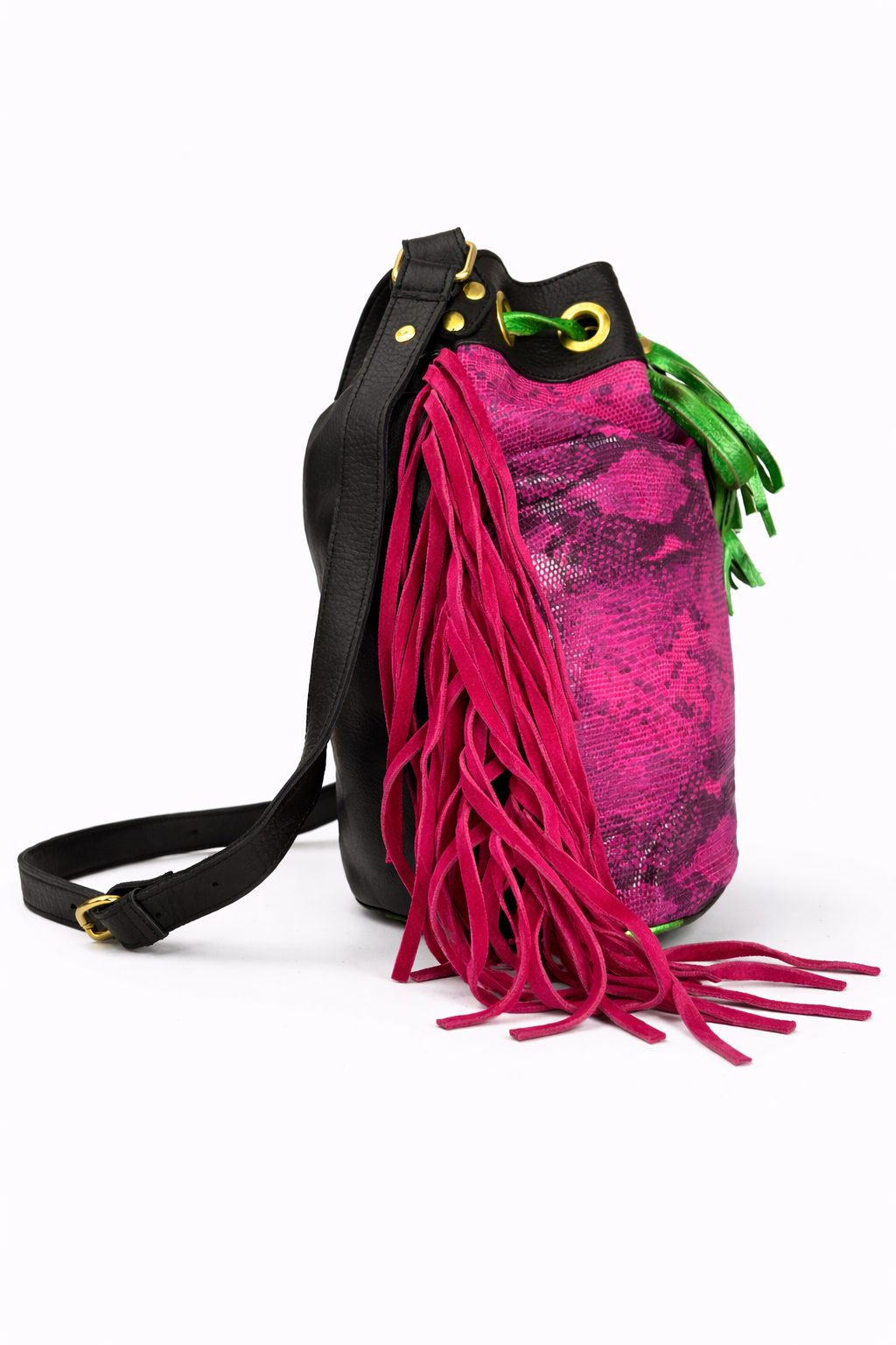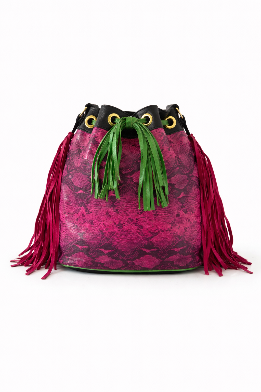 Bolso tipo saco con cuerpo en serpiente fucsia, contraste en verde y flecos laterales. Diseño